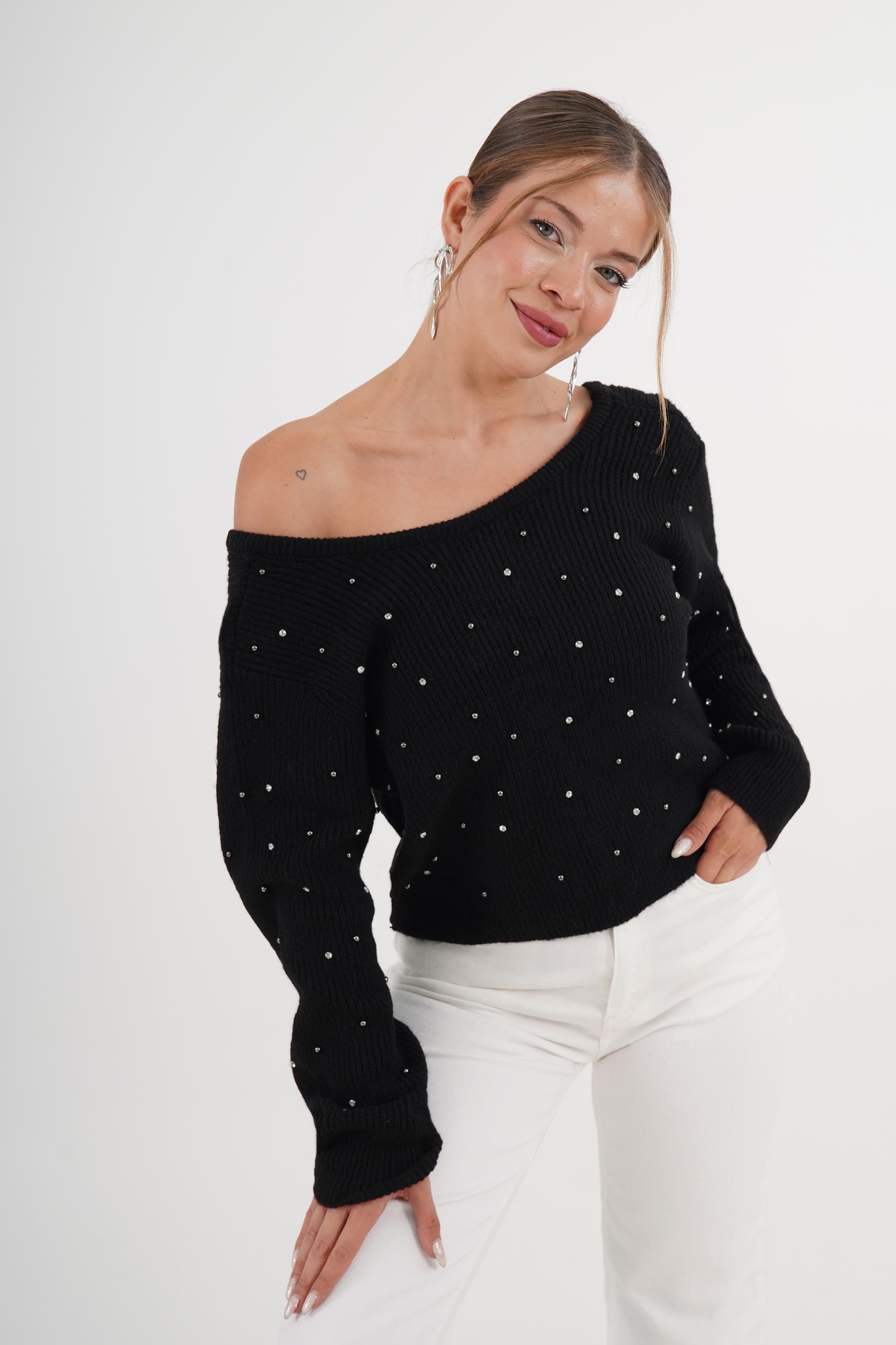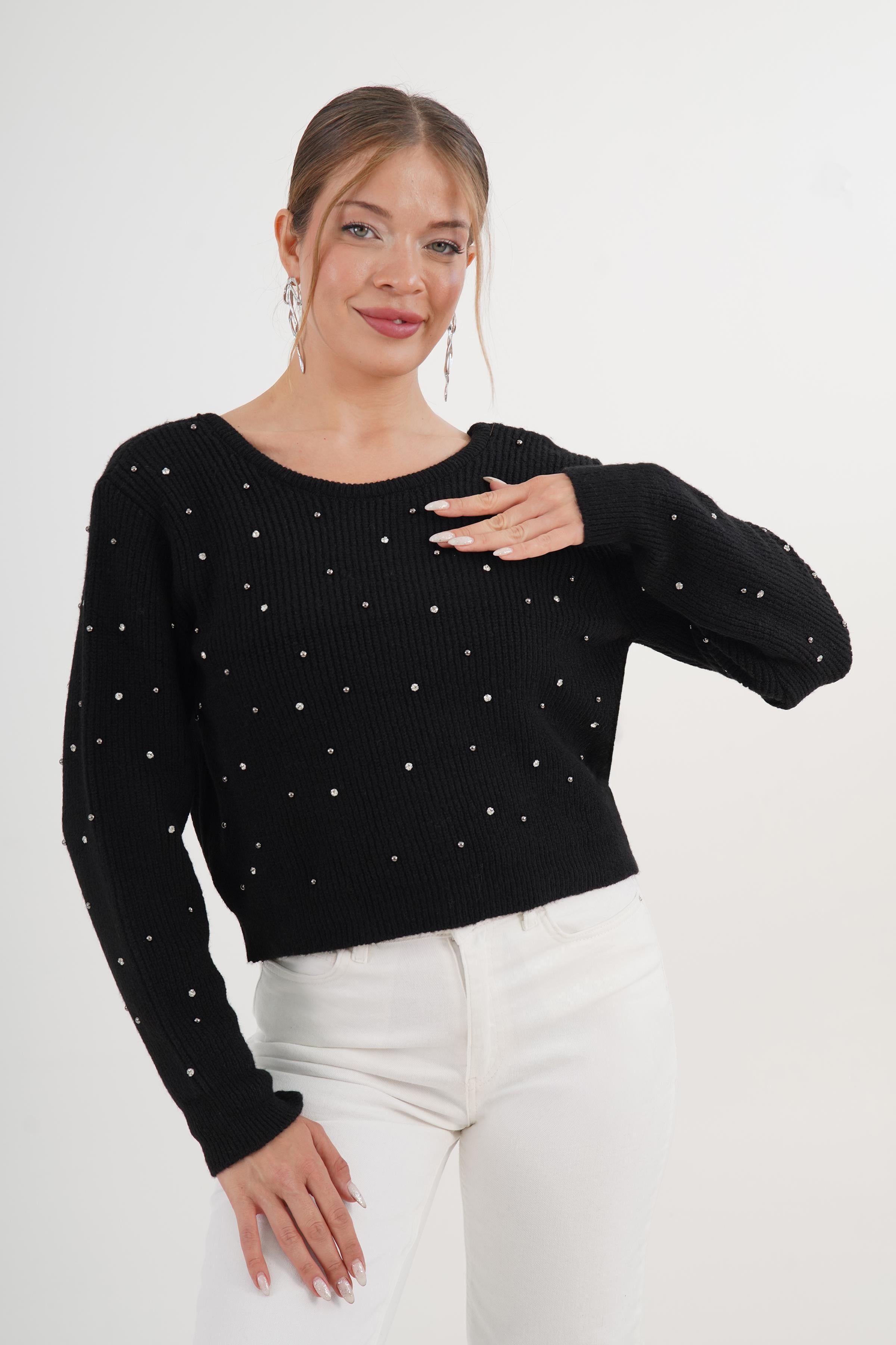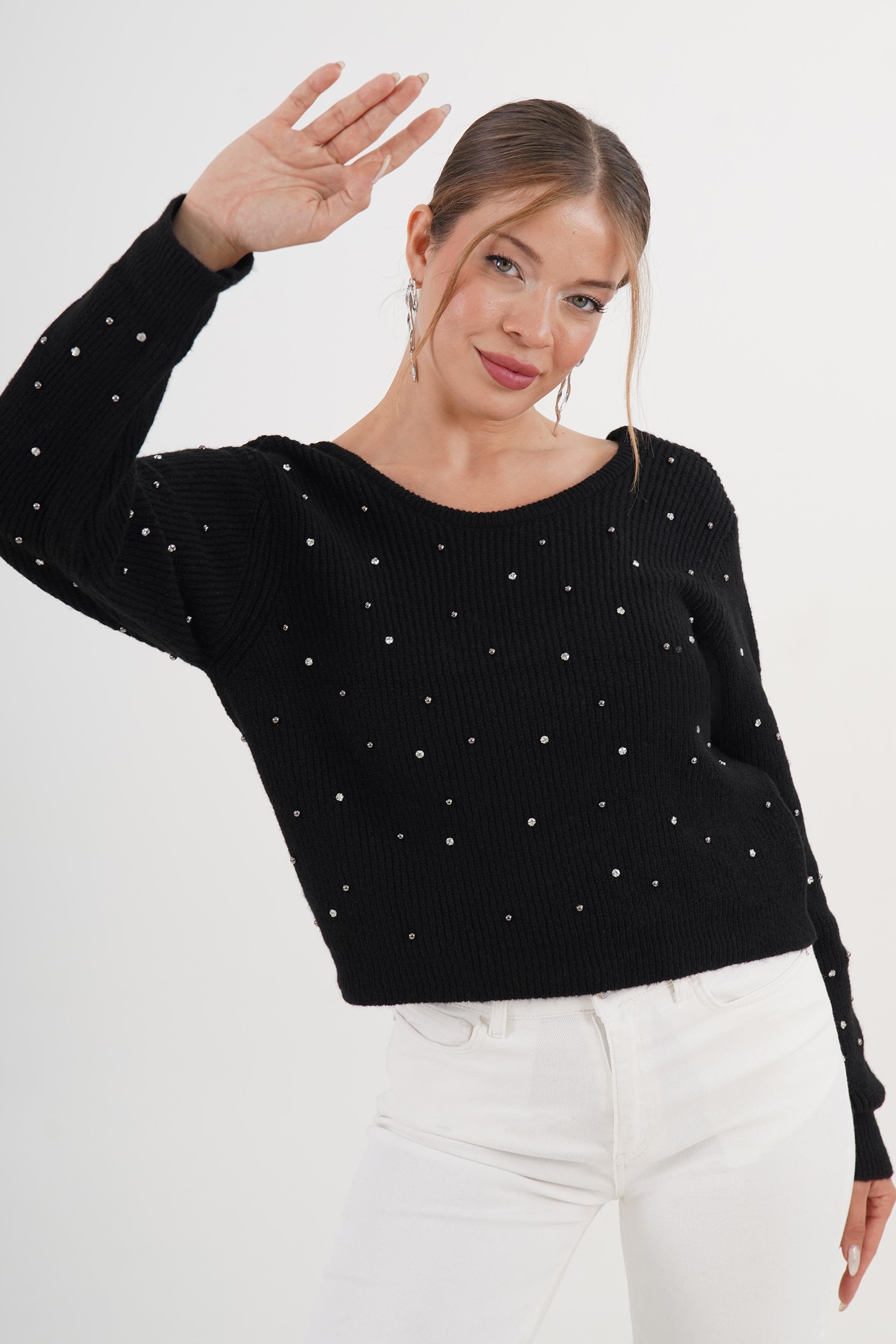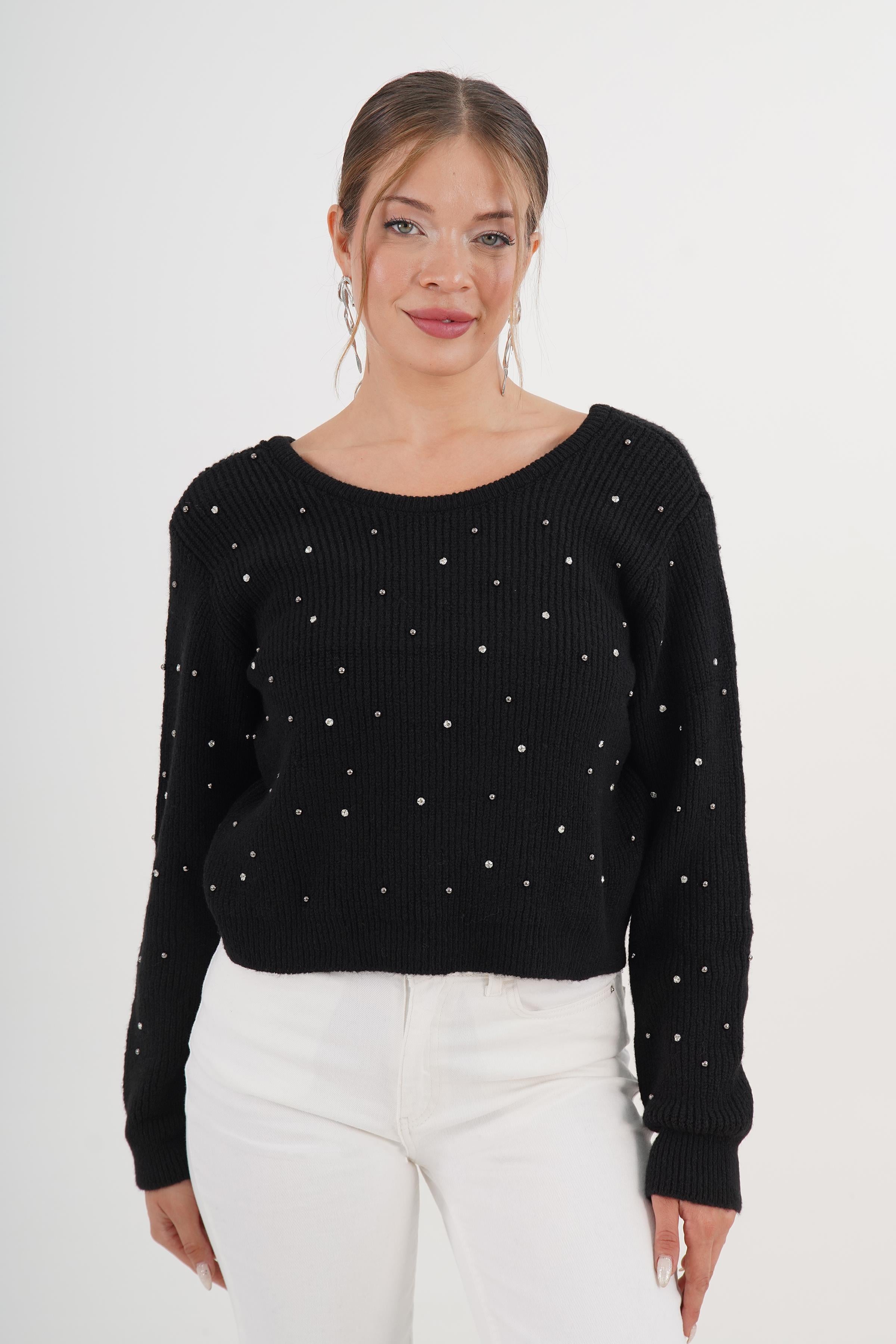 Sırt Dekolteli Siyah İşlemeli Pembe Toptan Kazak