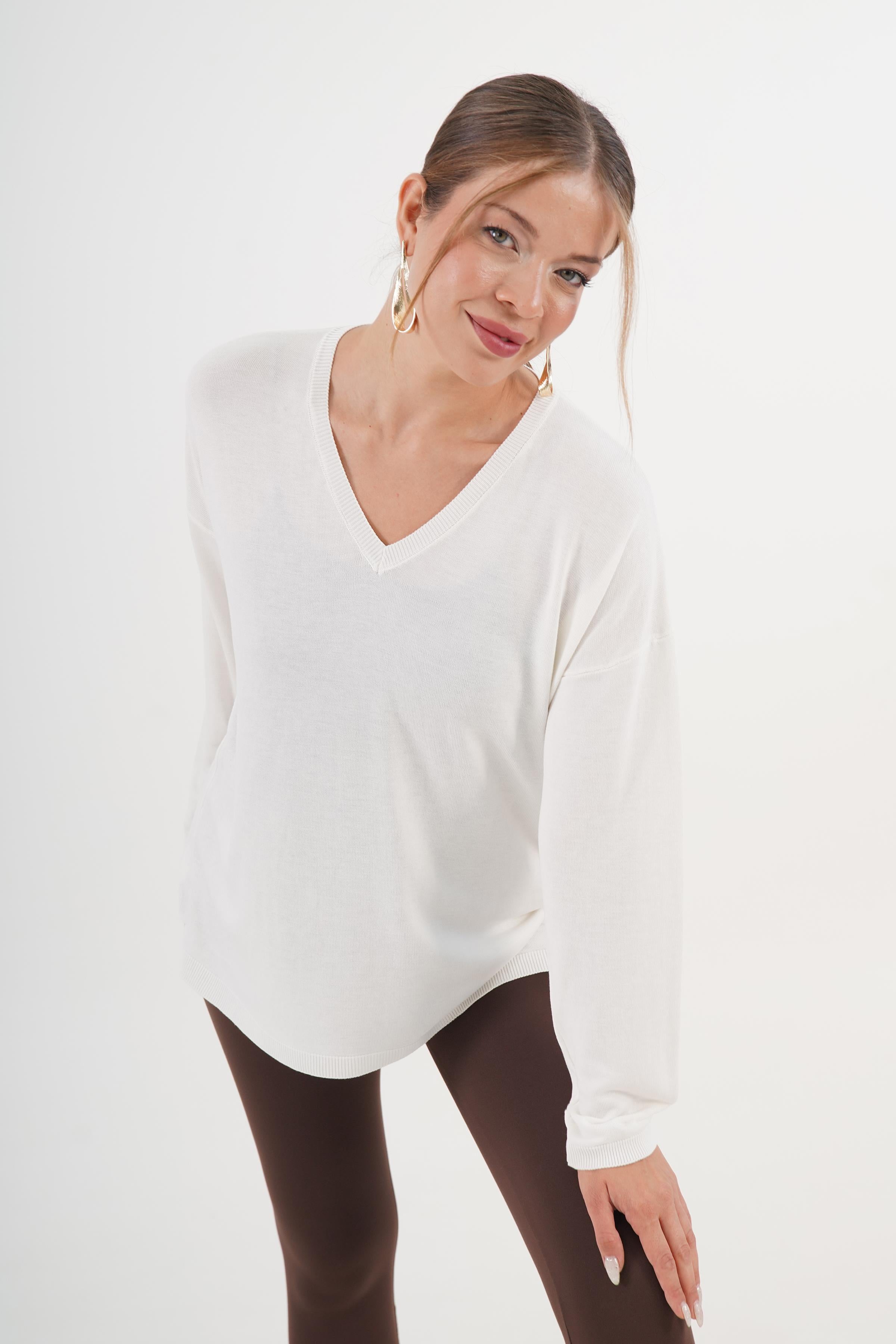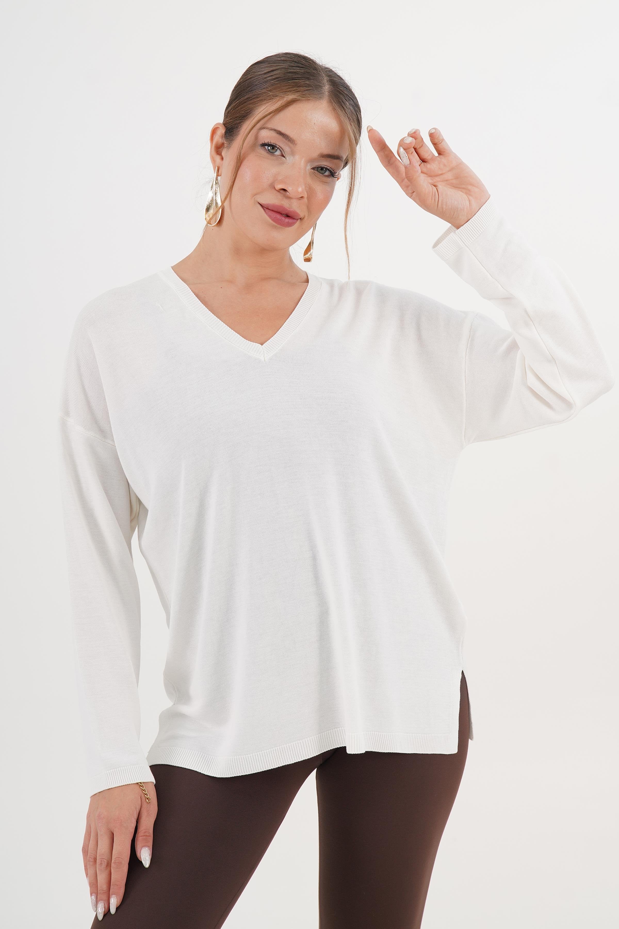 V Yaka Yan Yırtmaçlı Toptan Beyaz Triko Kazak