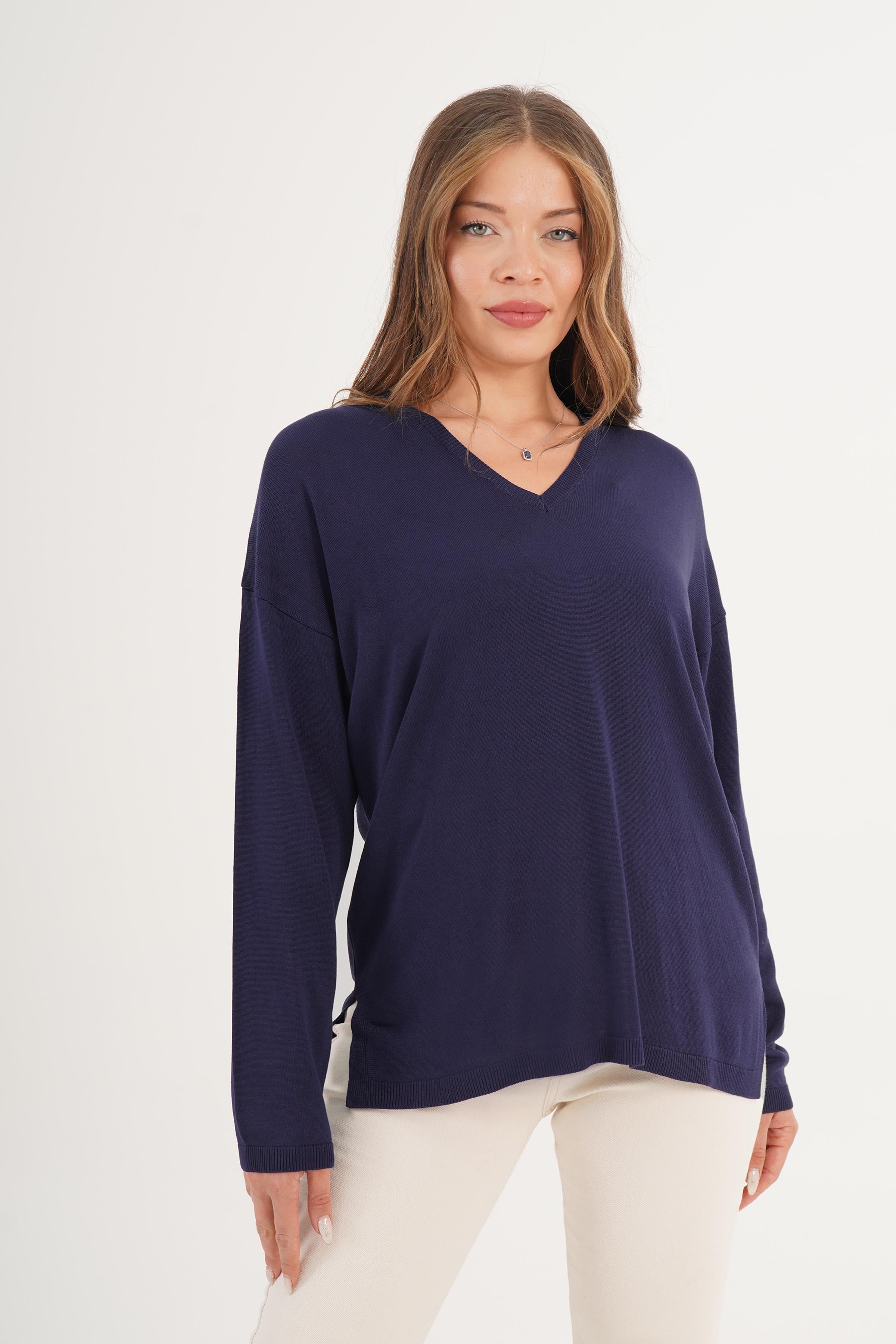 V Yaka Yan Yırtmaçlı Toptan Lacivert Triko Kazak