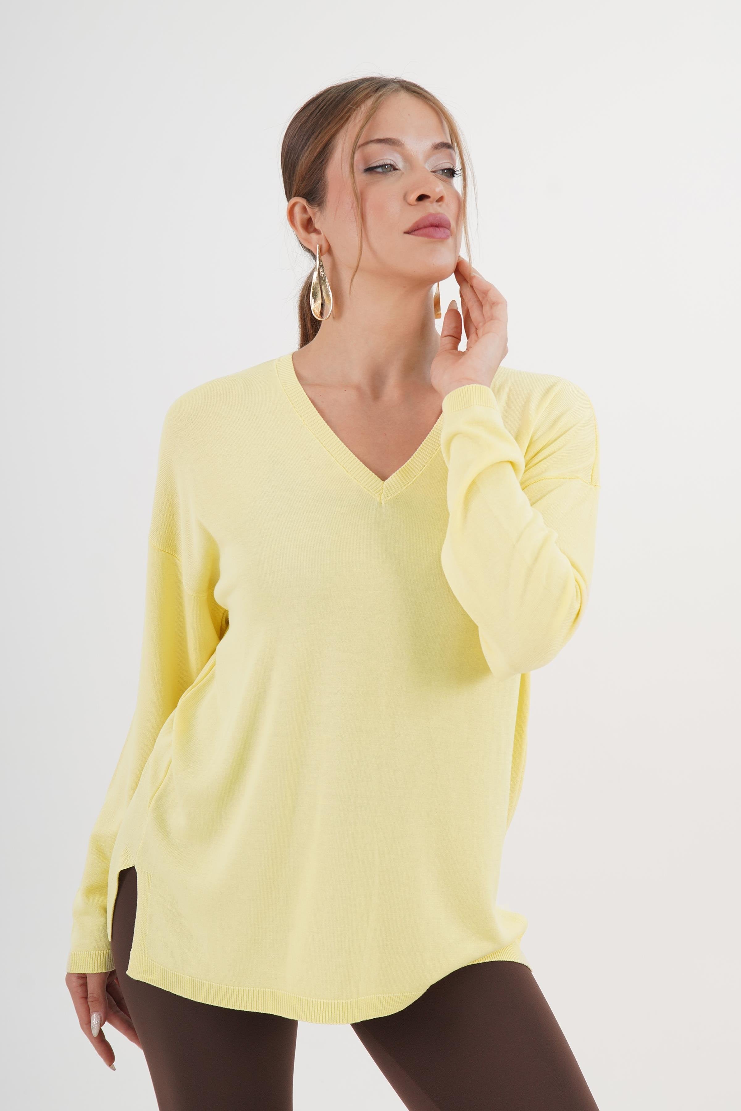 V Yaka Yan Yırtmaçlı Toptan Sarı Triko Kazak