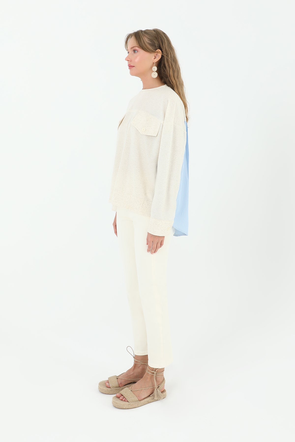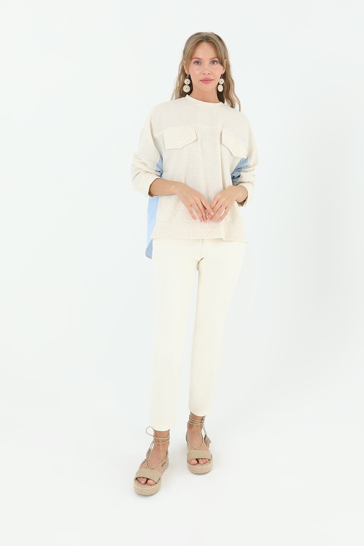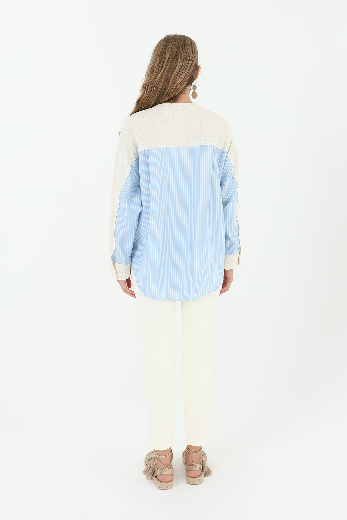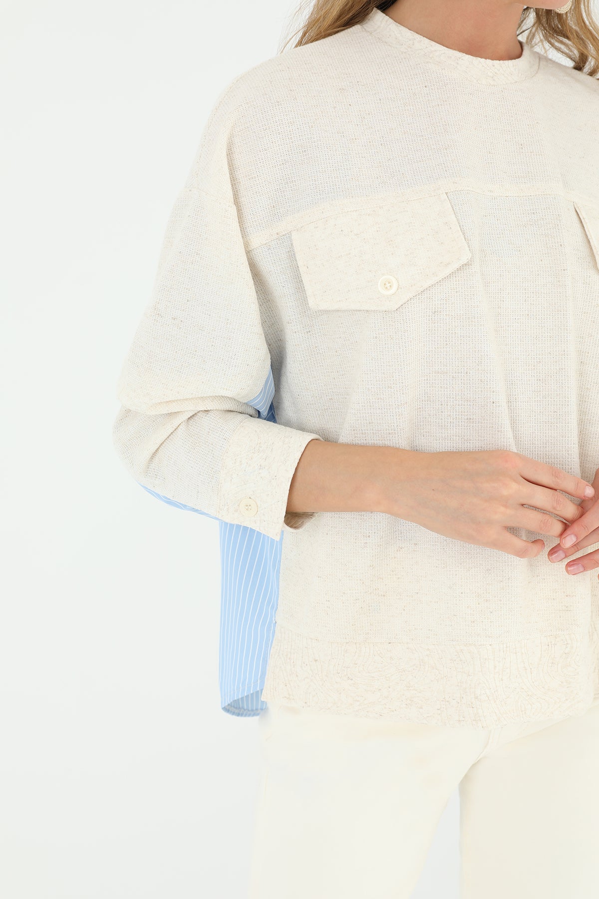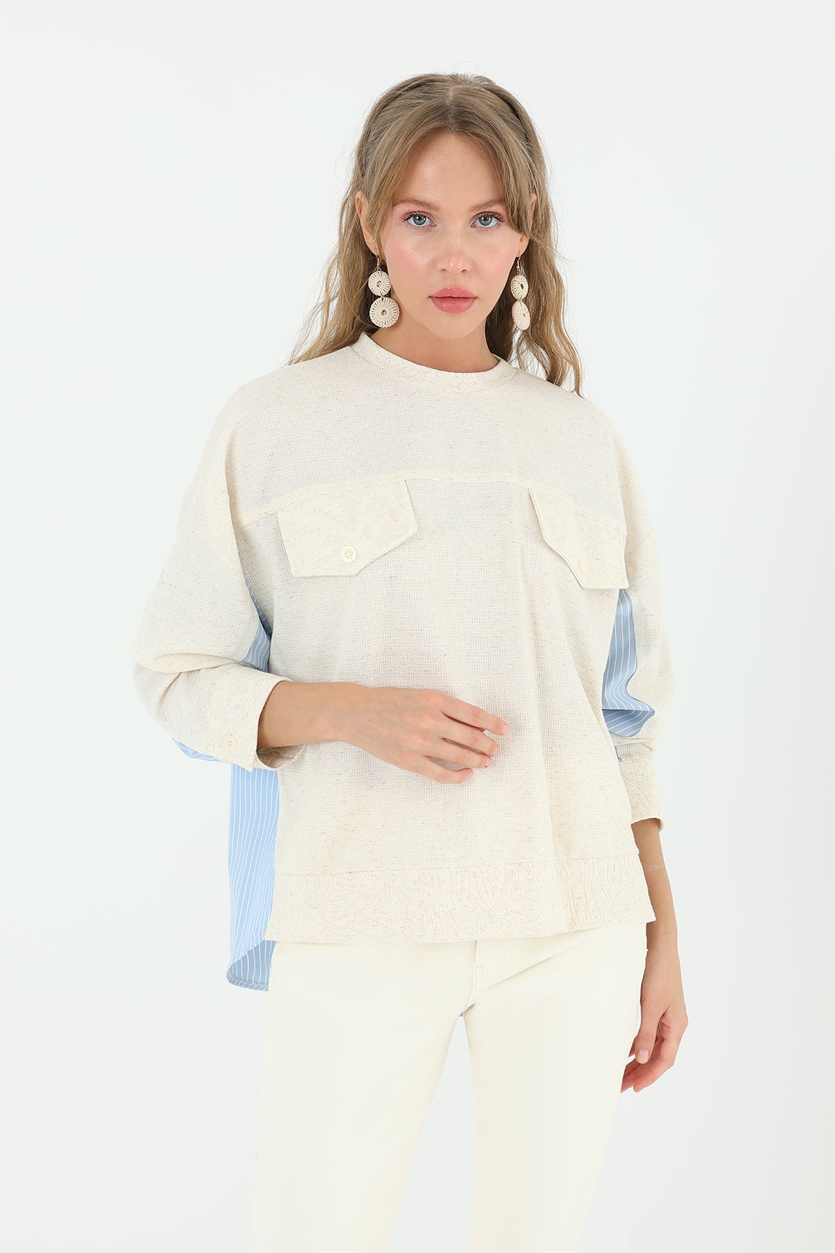 Önden cepli ve arkası poplin çizgili kumaştan olan bu bluz, kadınlara pratik ve şık bir seçenek sunuyor. Cepler, günlük kullanımda işlevselliği artırırken, arka taraftaki çizgili poplin kumaş da tarzınıza renk katıyor.