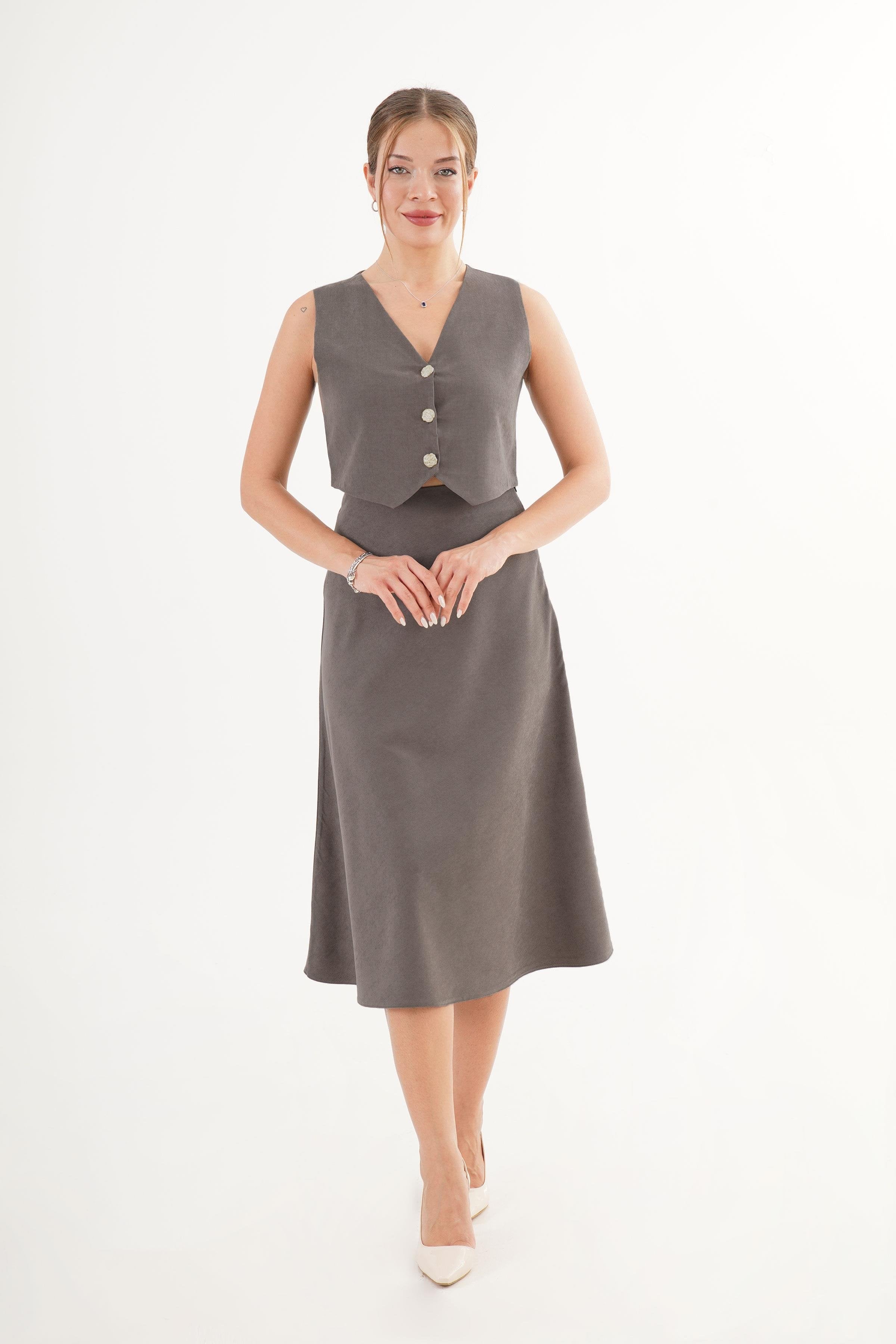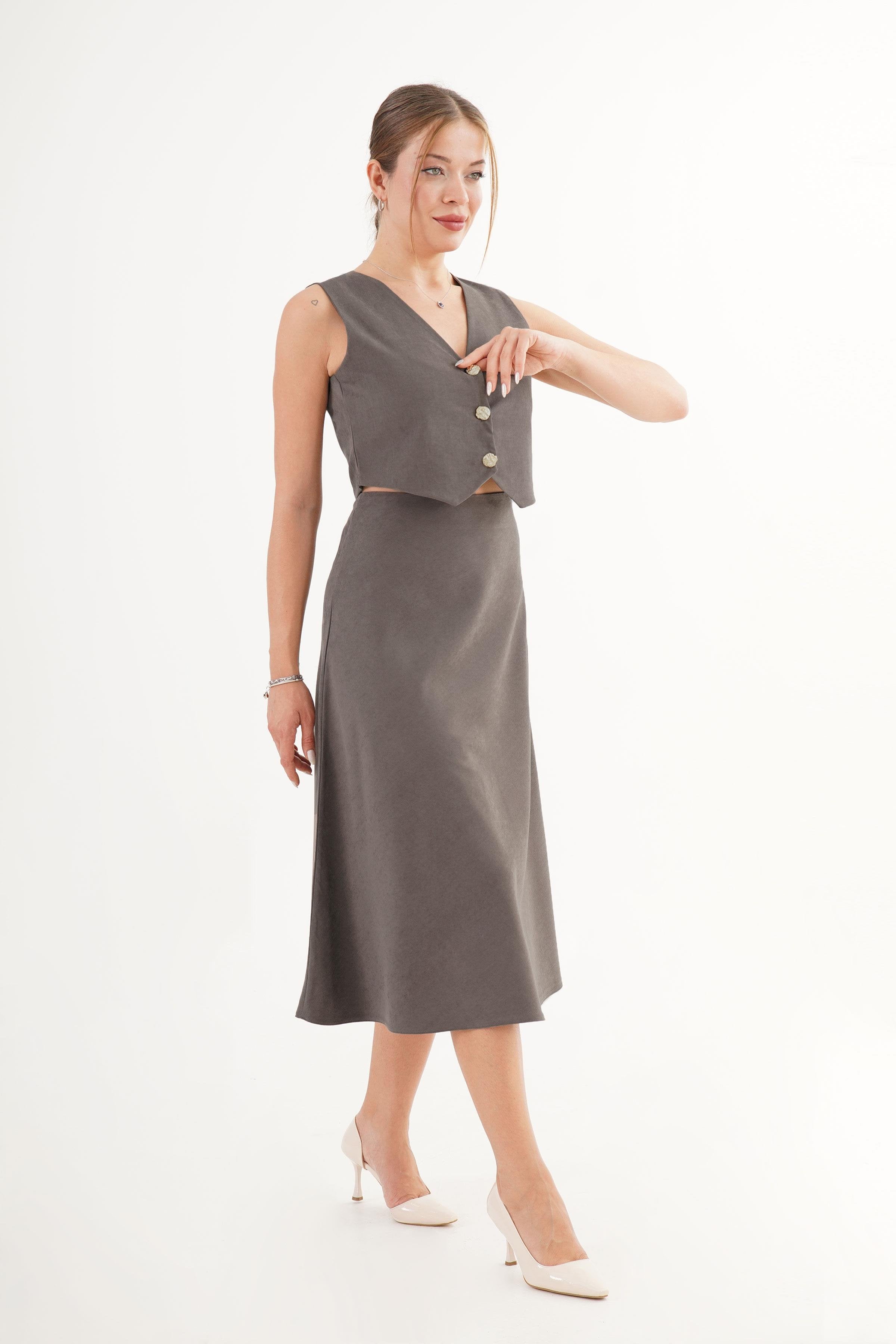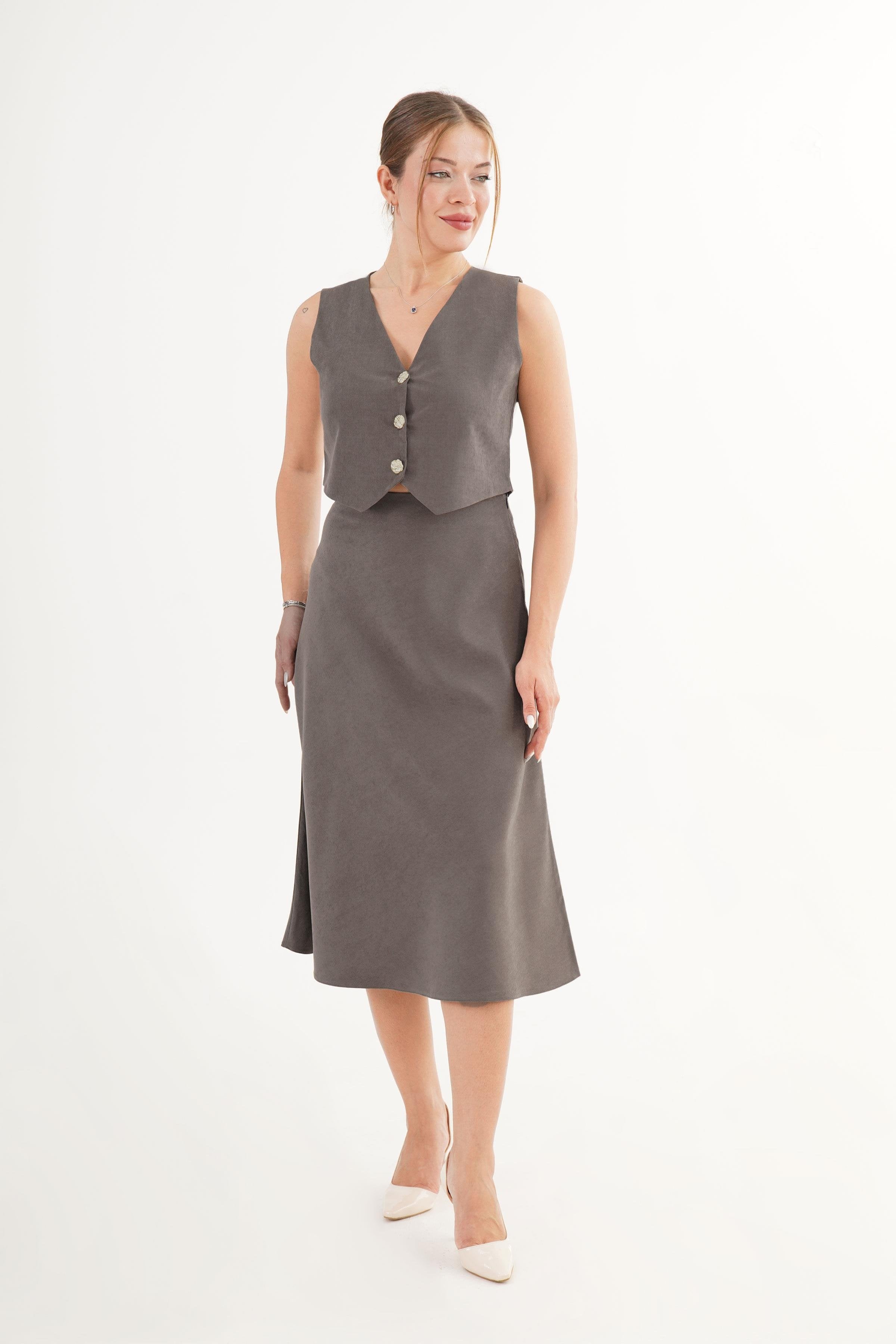 Ürün ÖlçüleriAlt Boy80 cmAlt Basen100 cmAlt Bel72 cmÜst Boy42 cmÜst Göğüs88 cmÜst Bel80 cmKumaş%85 Polyester %15 Modal Şıklık ve zarafeti aynı anda sunan premium yelek etek süet ikili takım, modern tasarımıyla butik koleksiyonlarınıza değer katıyor. Yumuşak süet dokusu ve premium kalitesi sayesinde hem özel davetlerde hem de günlük şıklıkta tercih edilebilecek bu takım, kadın giyimde trendleri yakalamak isteyen butik sahipleri için idealdir. Kadın toptan giyim üretiminde fark yaratan bu ikili takım, zarif detaylarıyla müşterilerinize farklı bir stil sunar. Yeni sezonda satışlarınıza prestij katmak için şimdi stoklarınıza ekleyin! Manken Ölçüleri Boy : 1.75 cm