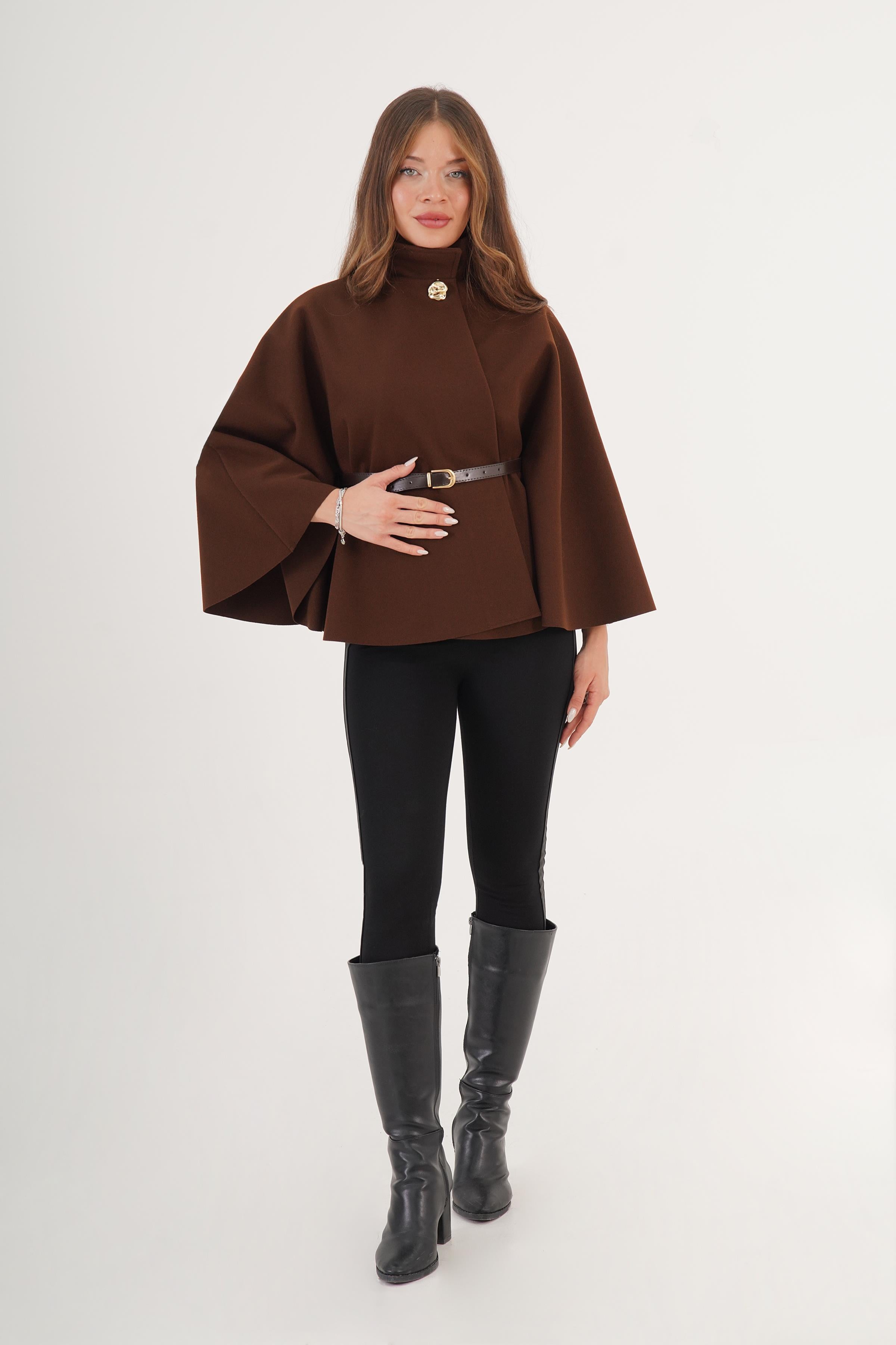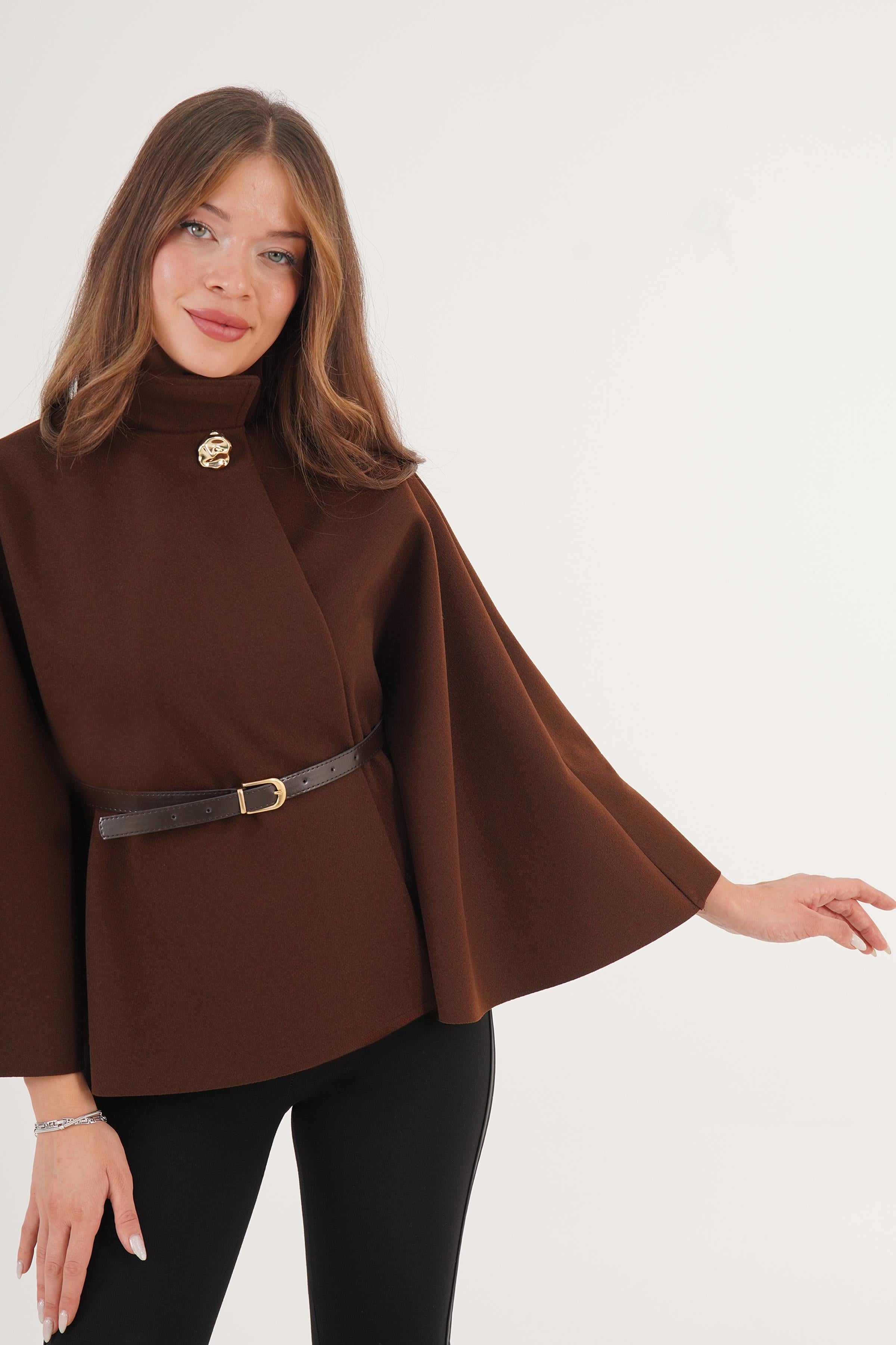 Kemer Detaylı Tek Düğmeli Toptan Kahve Panço
