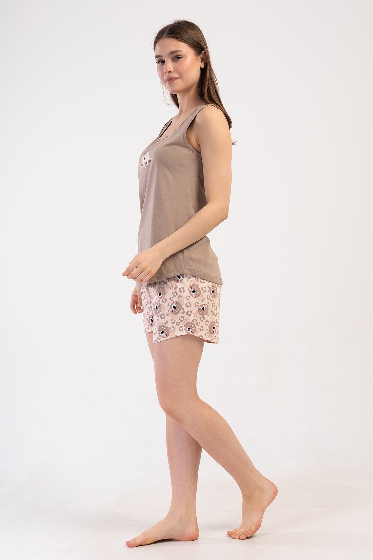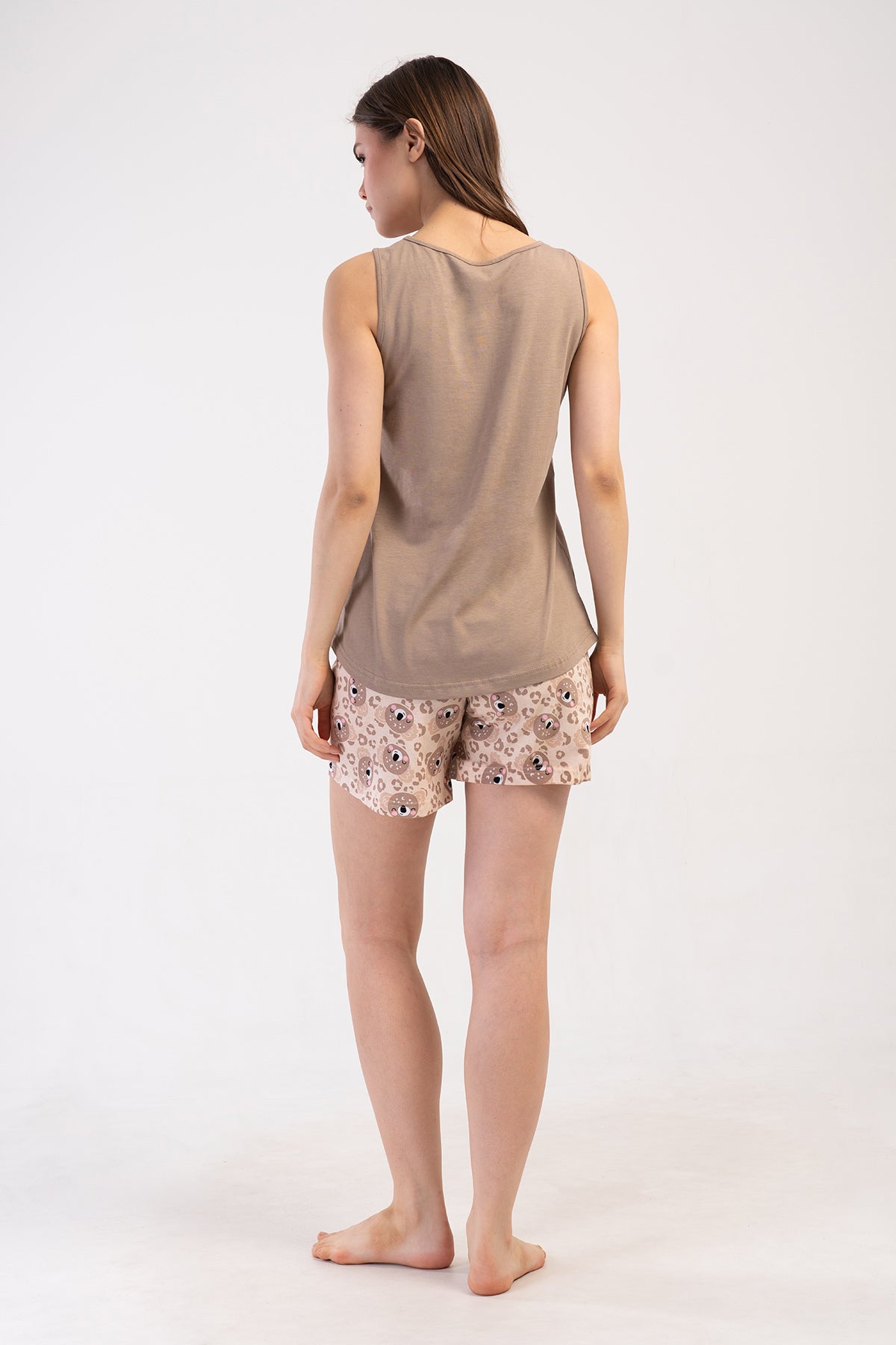 Woman Supreme Soft Beige Sleeveless Short Set. Vienetta short pajama sets are designed with lightweight fabrics to keep you cool during warm summer nights. They blend comfort and style for perfect homewear.