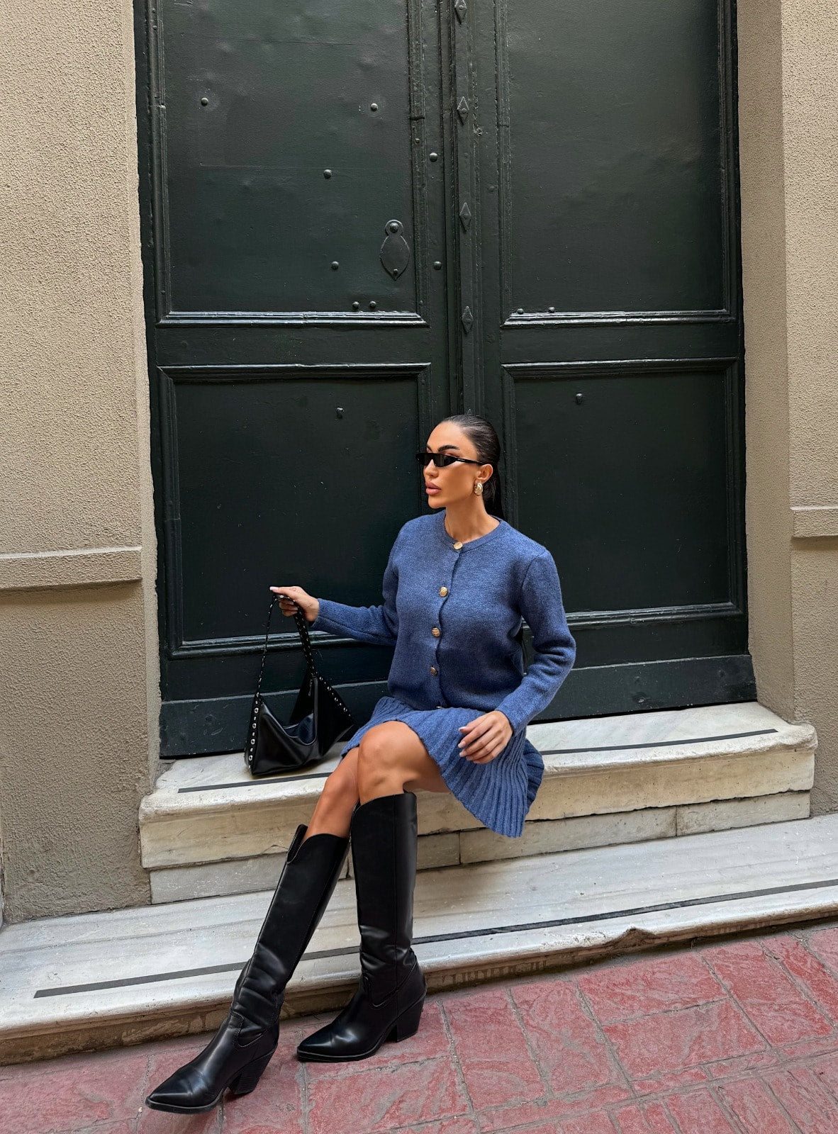 Bisiklet Yaka Hırka Ve Pile Detaylı Etek Triko Takım