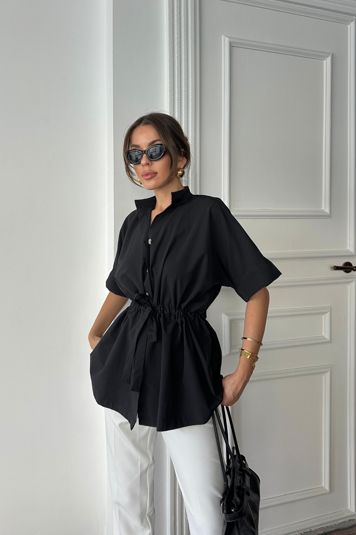 BEL BÜZGÜ DETAYLI POPLİN GÖMLEK - Siyah