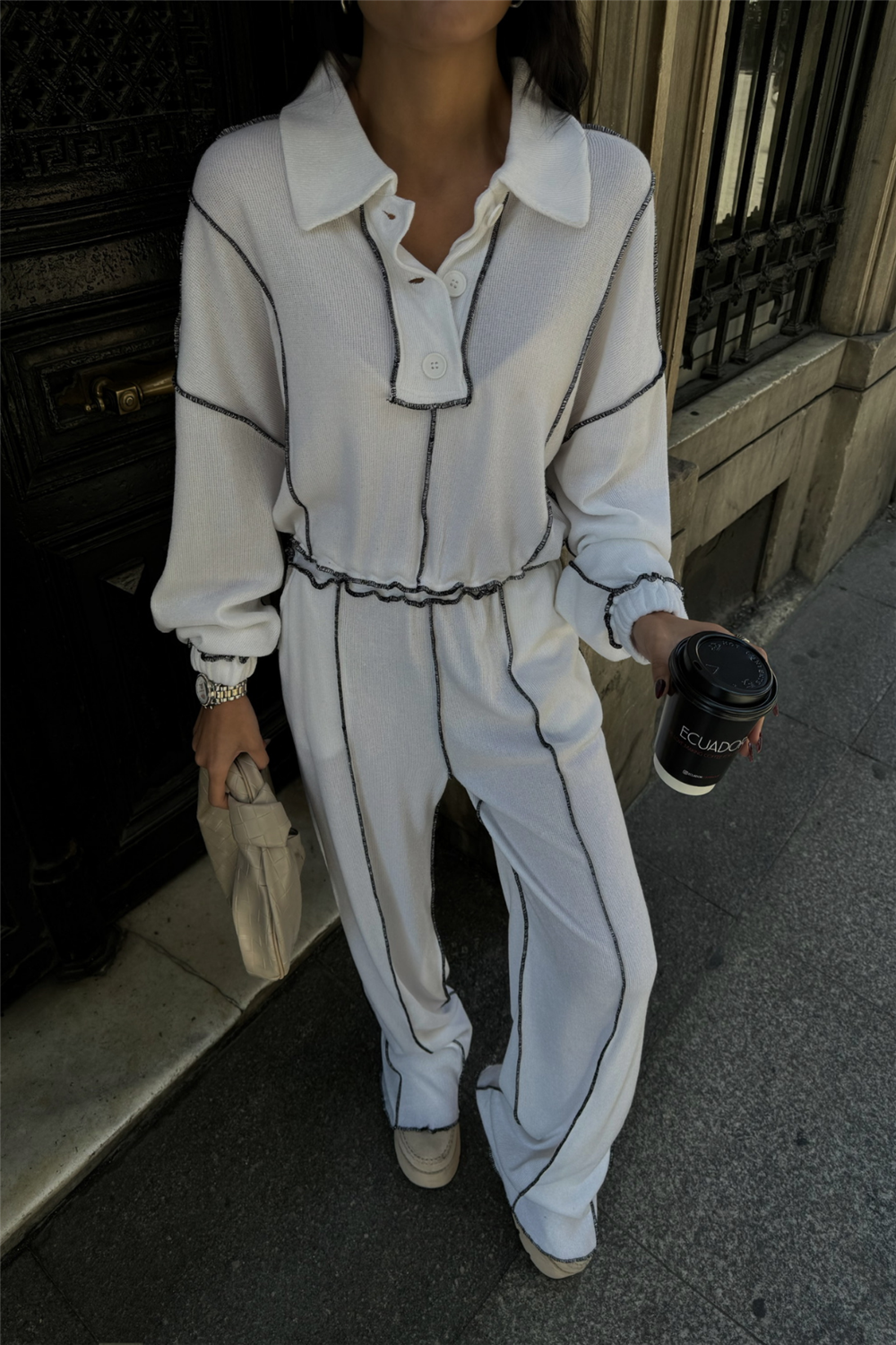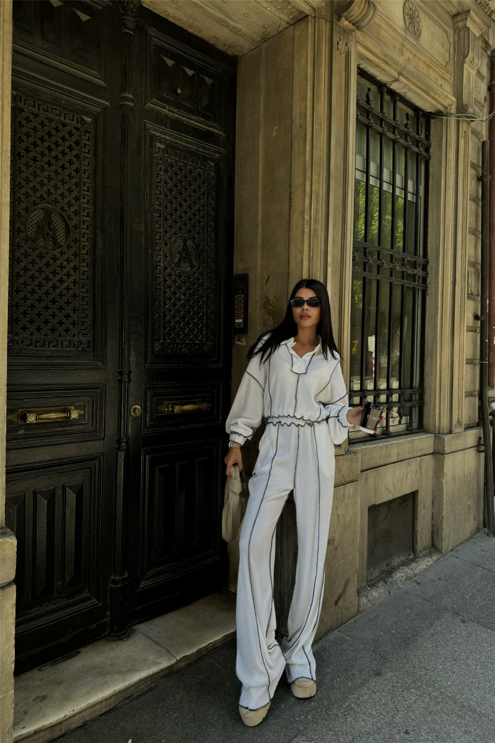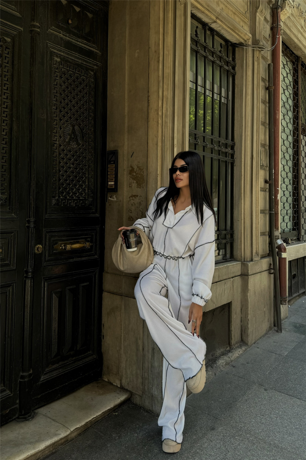 BİYELİ BLUZ PANTOLON TAKIM ŞÖNİL KUMAŞ - Beyaz
