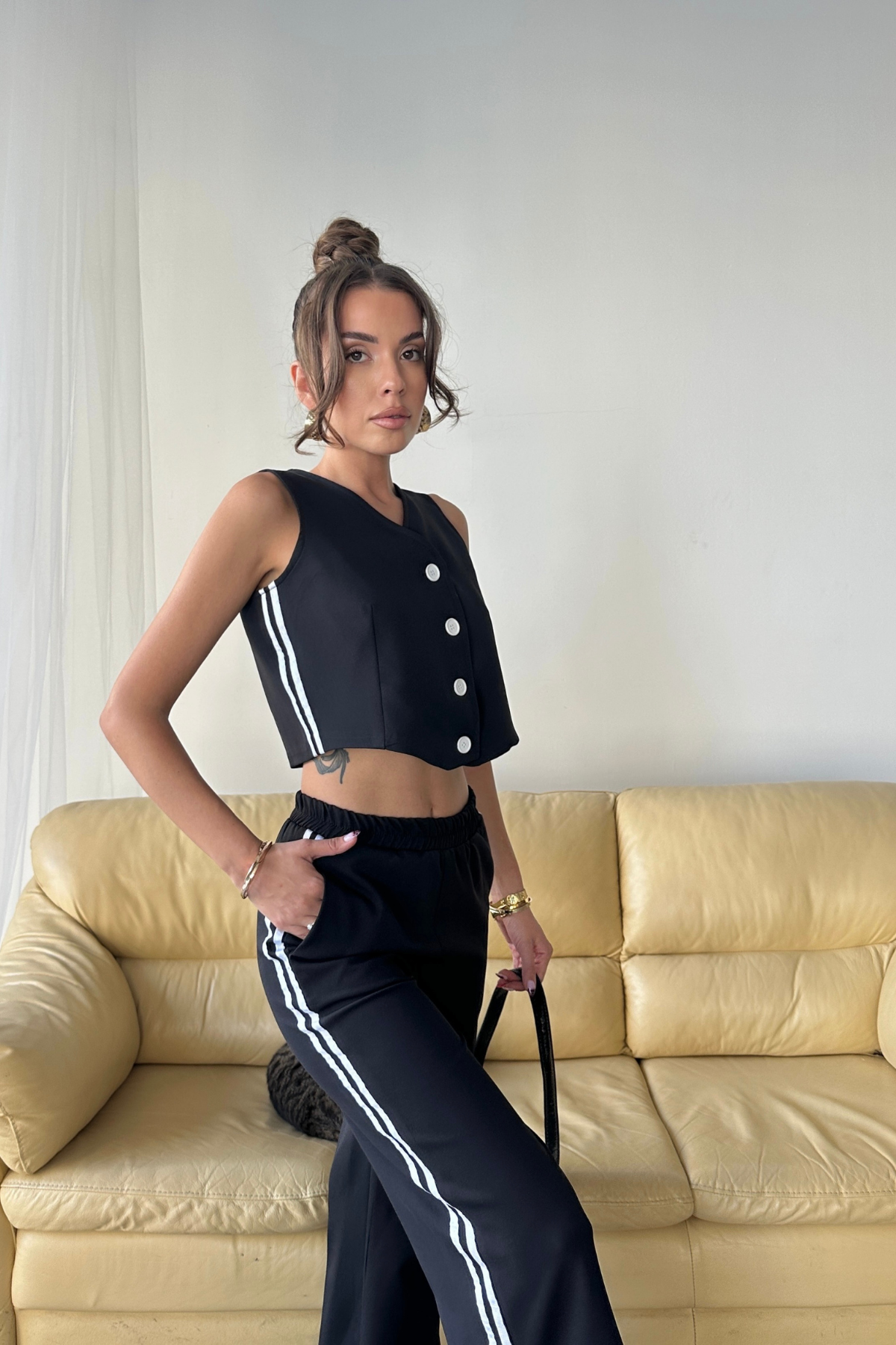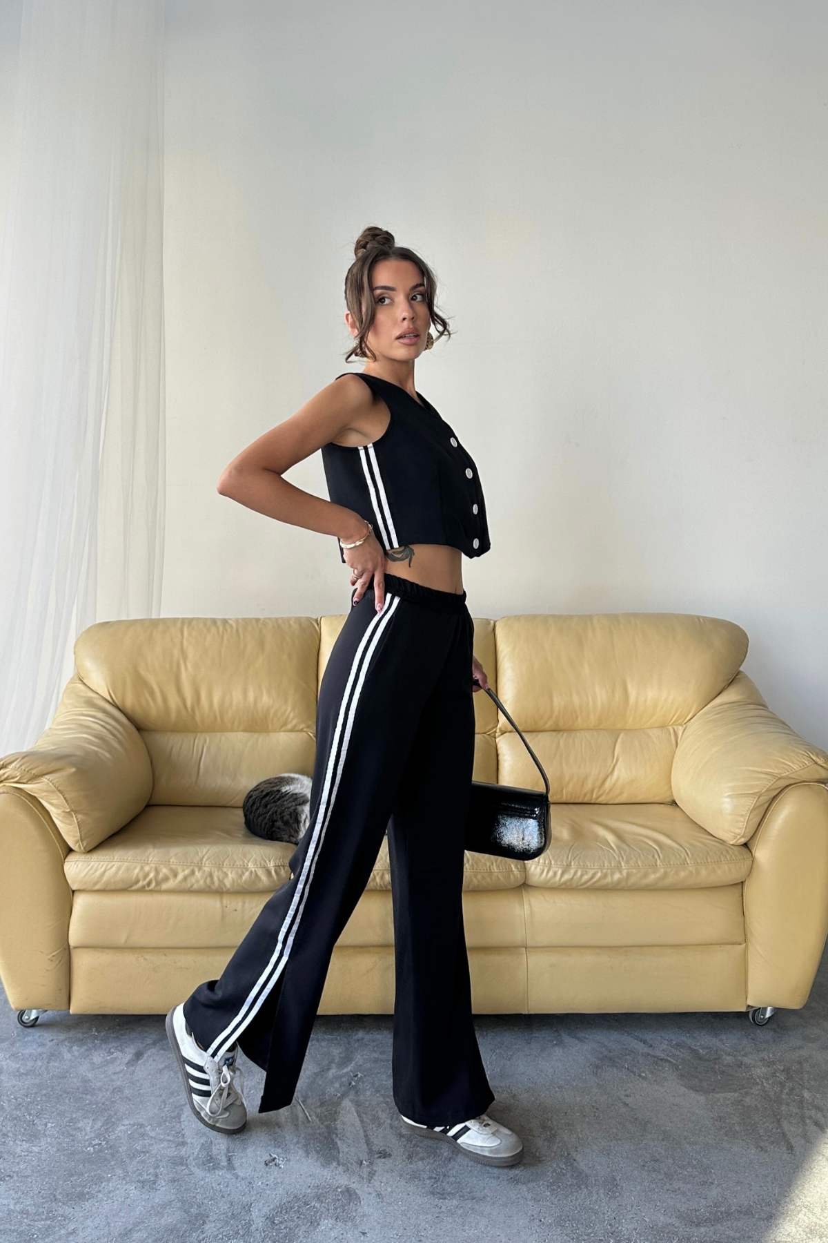 CROP YELEK - PAÇASI YIRTMAÇ DETAYLI YANLAR ŞERİT PANTOLON TK - Siyah