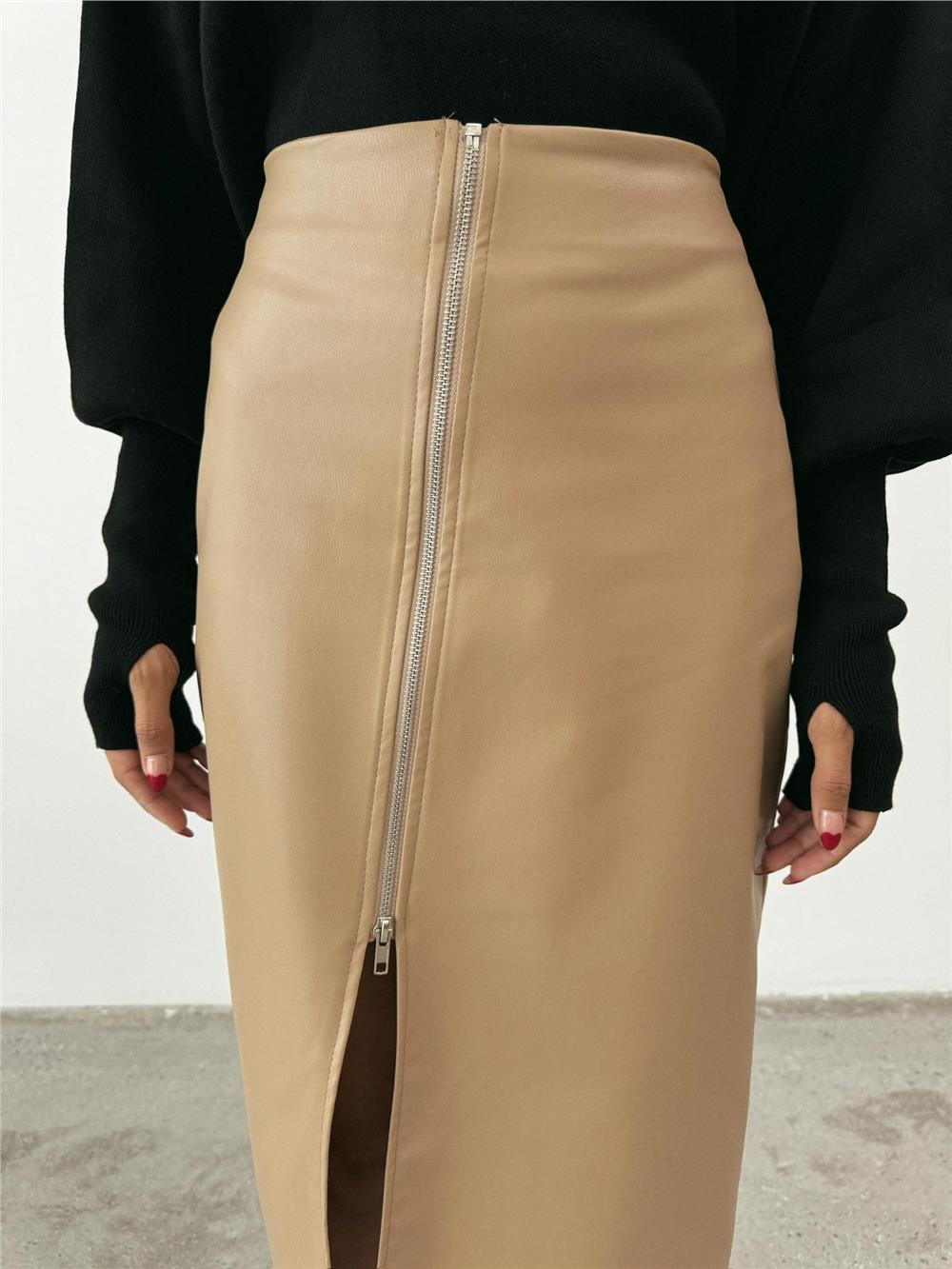DERİ FERMUARLI ŞANEL BOY ETEK - Bej