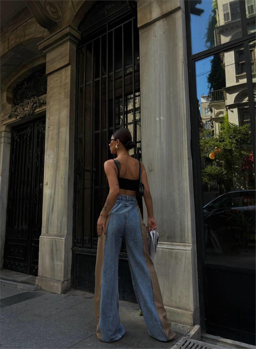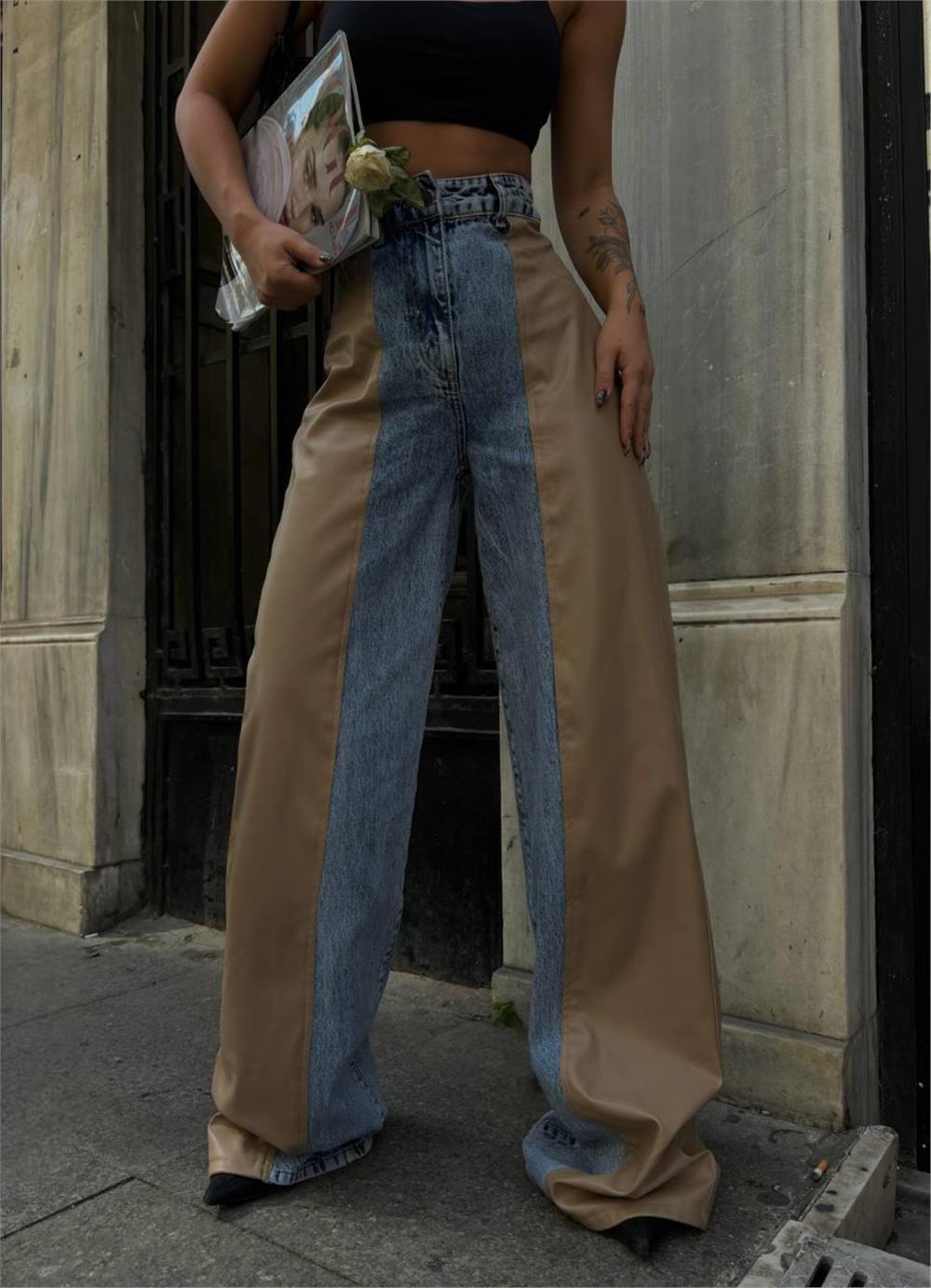 DERİ - KOT PARÇALI PANTOLON - Bej