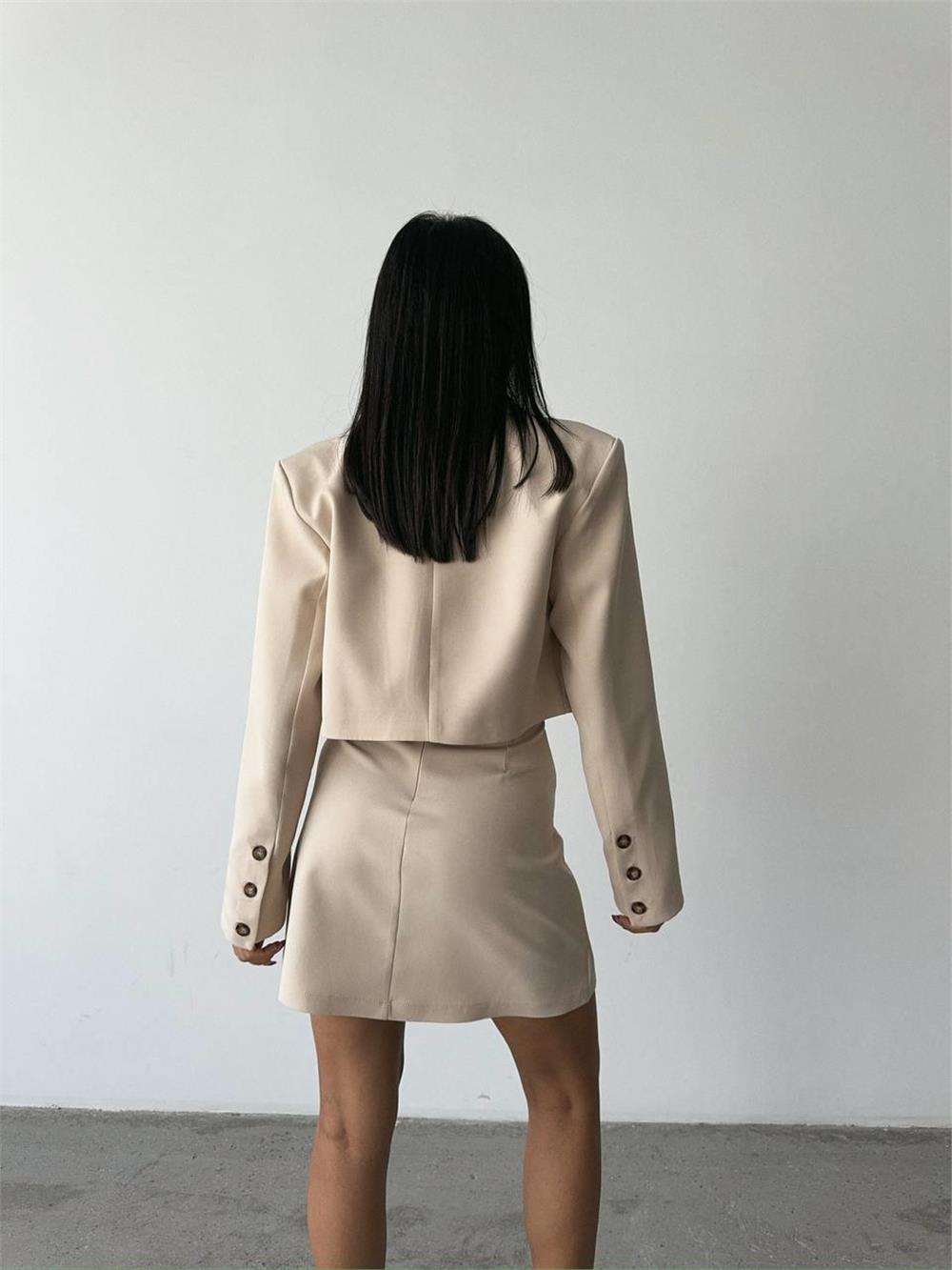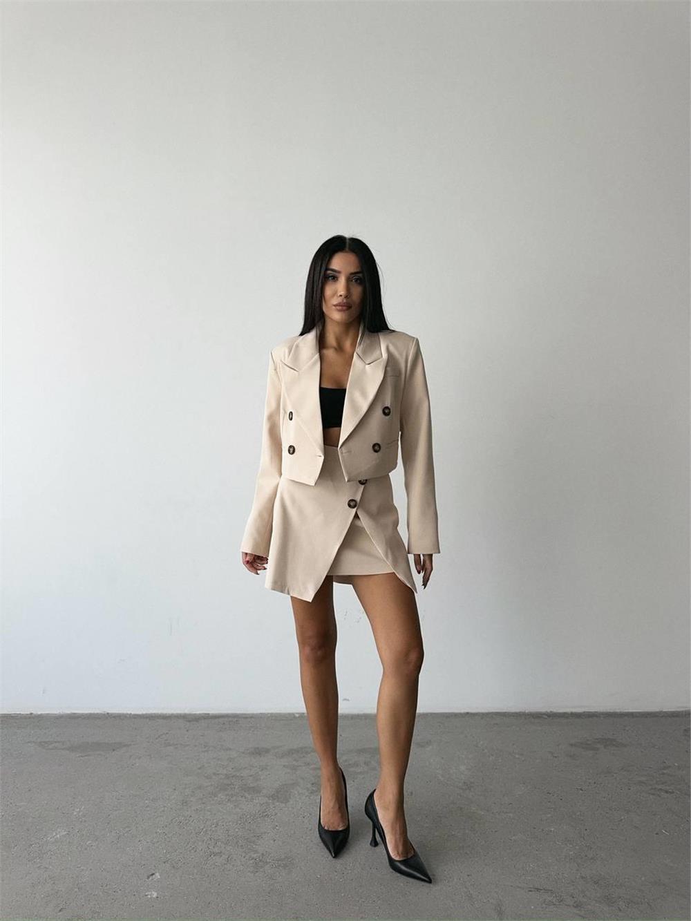 DÜĞME DETAYLI ETEK - CROP CEKET TAKIM - Taş