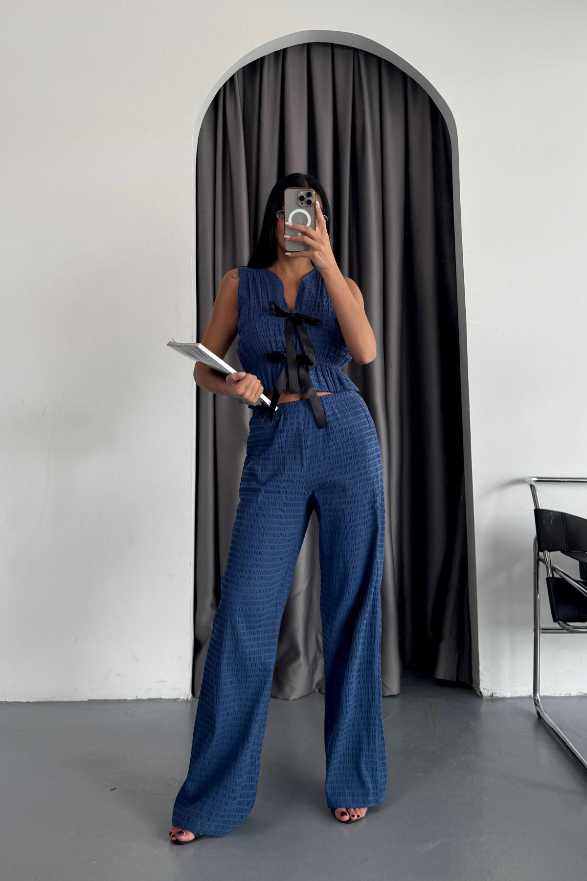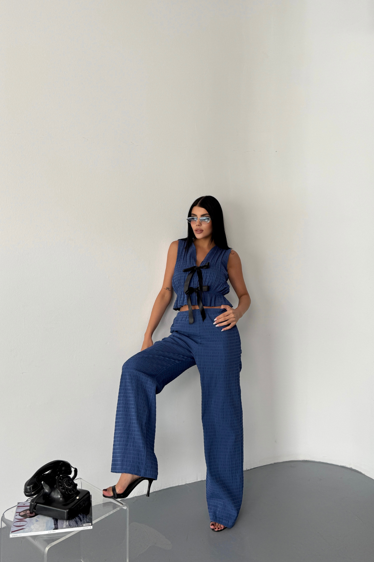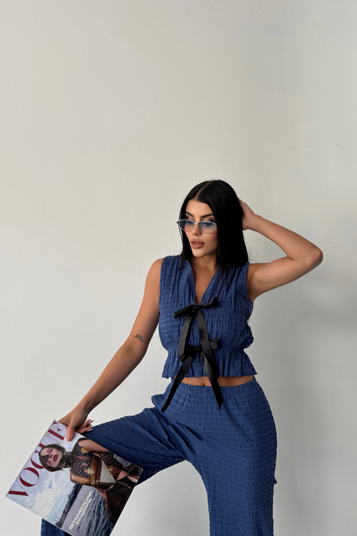 GOFRE BLUZ-PANTOLON TK KURDELE DETAYLI - Mavi