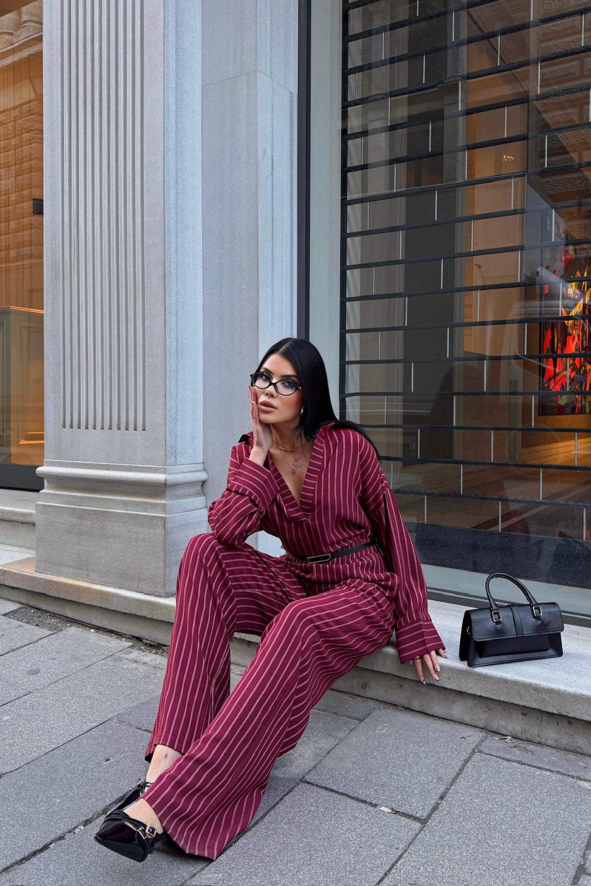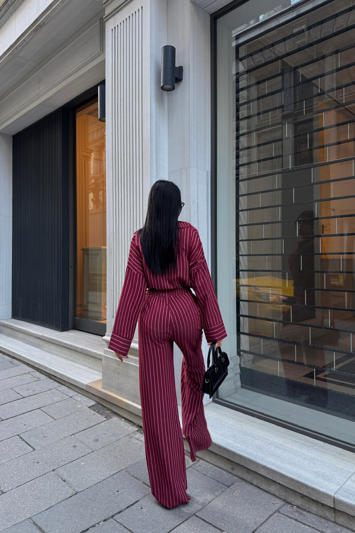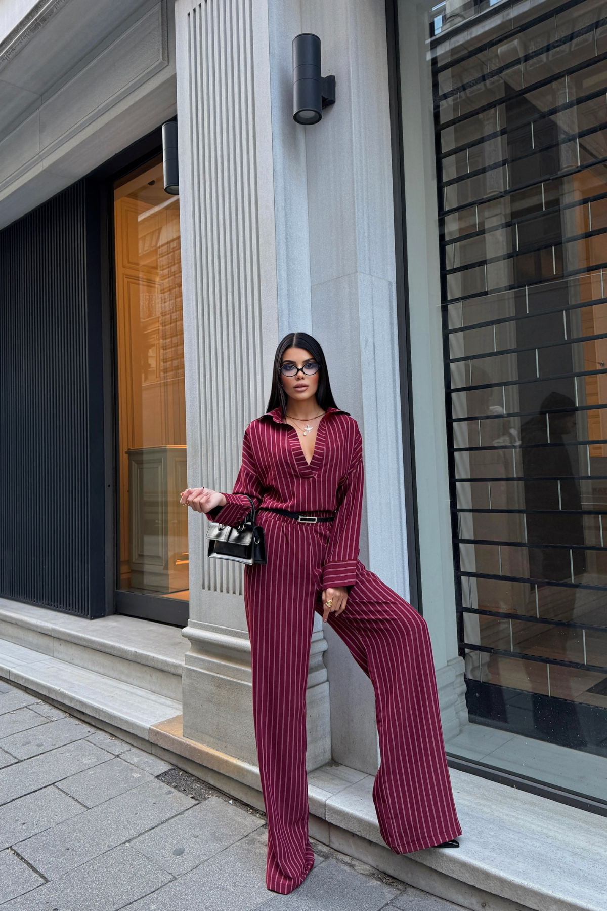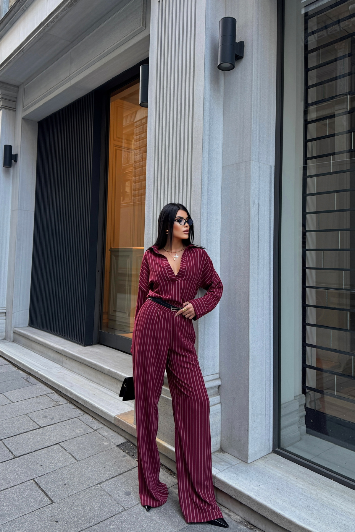 ÇİZGİLİ BLUZ - PANTOLON TAKIM - Bordo