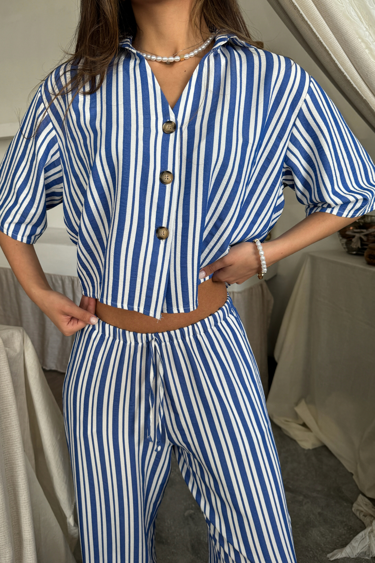 ÇİZGİLİ CROP GÖMLEK - SALAŞ PANTOLON TAKIM MODAL - Mavi