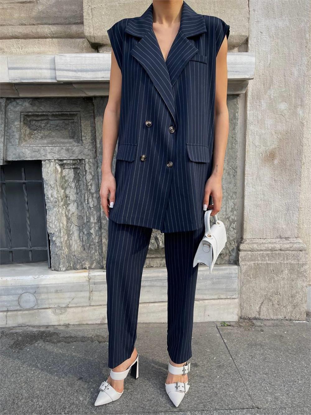 ÇİZGİLİ UZUN YELEK - PANTOLON TAKIM POLVİSCON - Lacivert