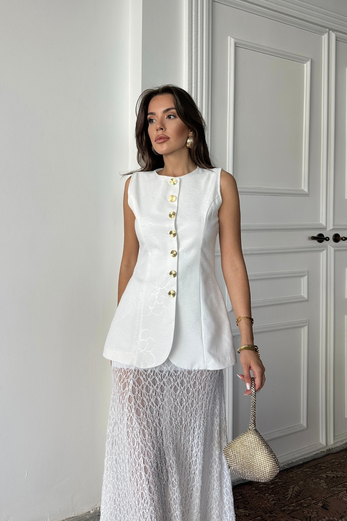 JAKAR KETEN YELEK BELDEN OTURTMALI GOLD DÜĞMELİ - Beyaz