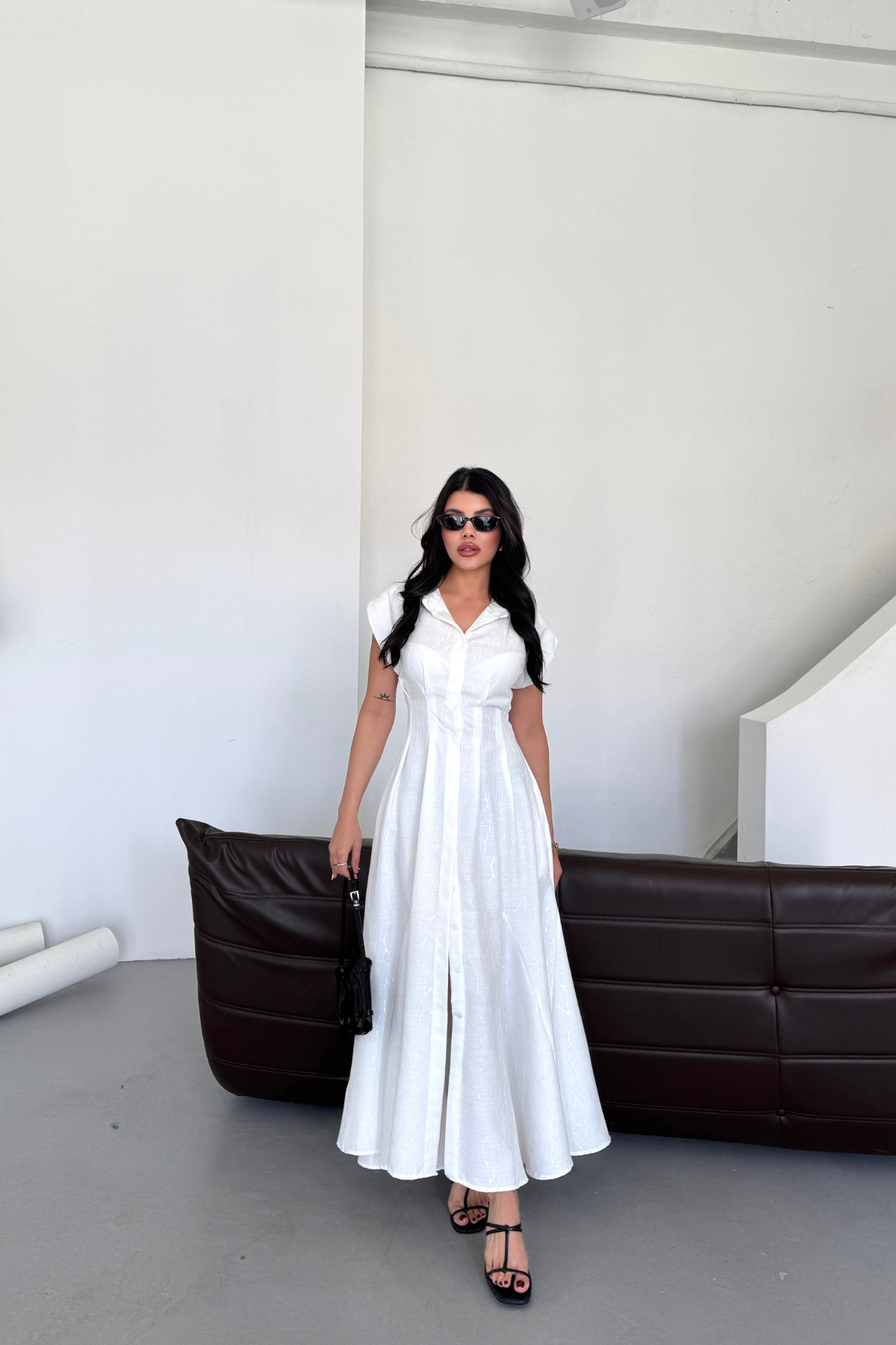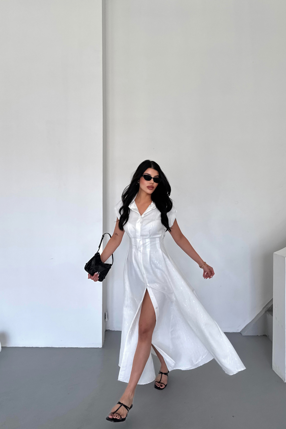 JAKARLI KETEN ELBİSE ÖNDEN YIRTMAÇLI CEPLİ - Beyaz