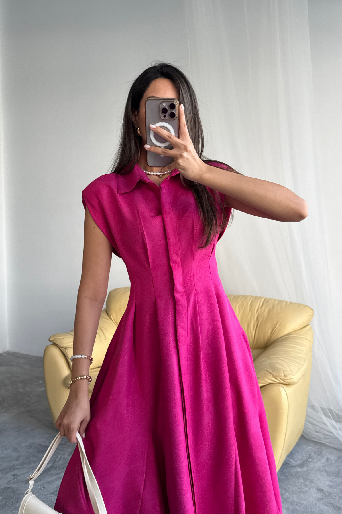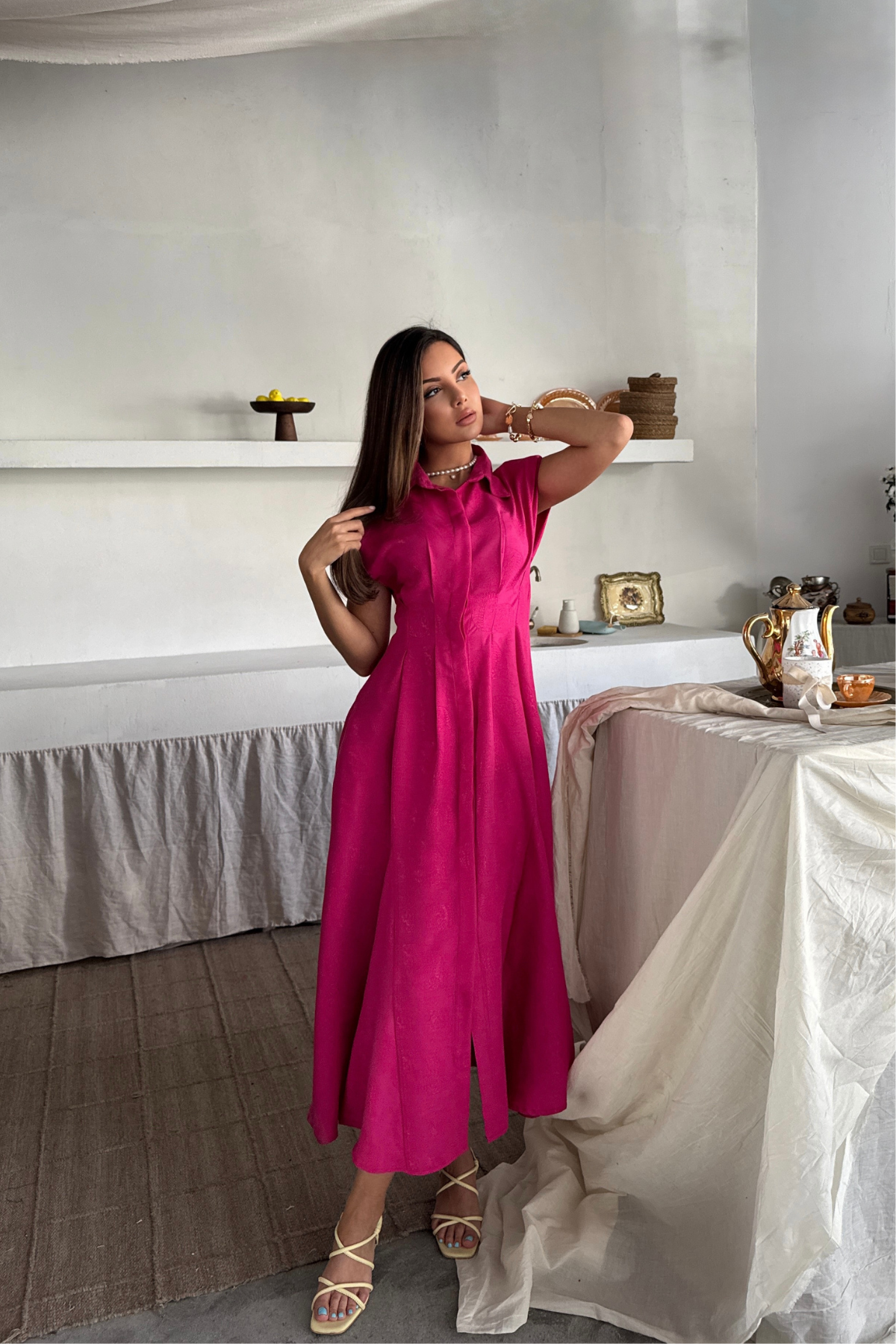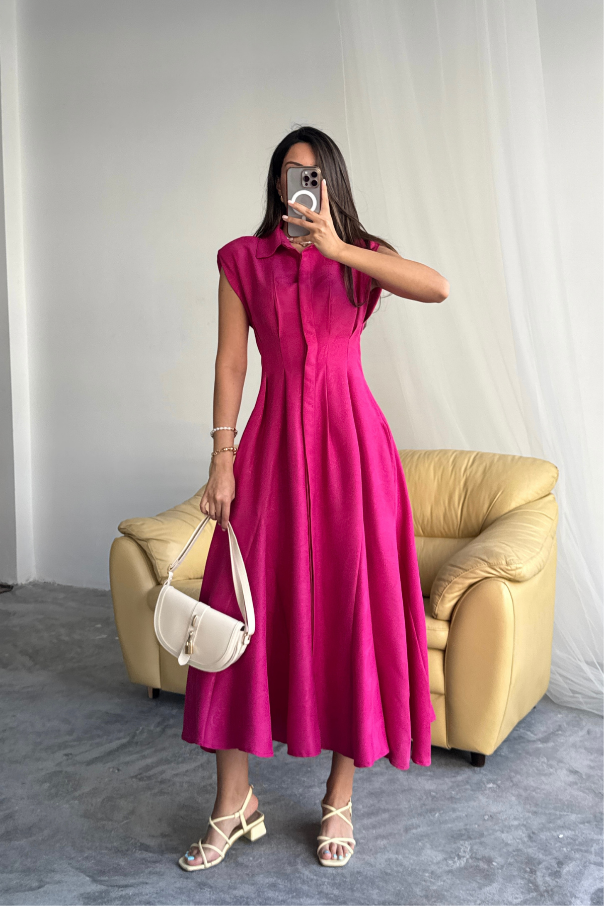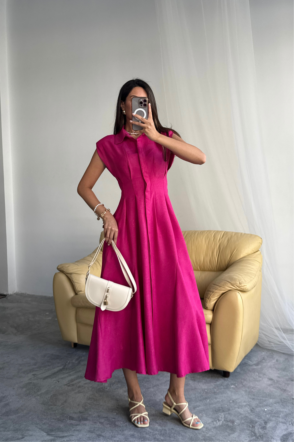 JAKARLI KETEN ELBİSE ÖNDEN YIRTMAÇLI CEPLİ - Fuşya