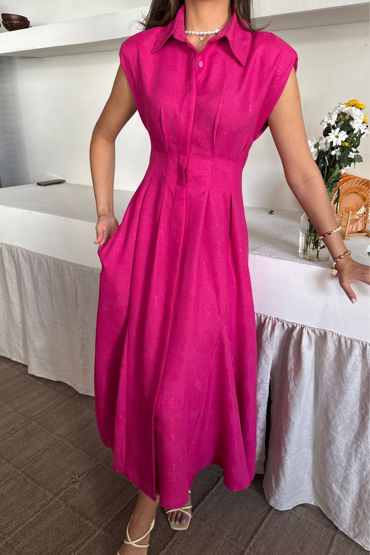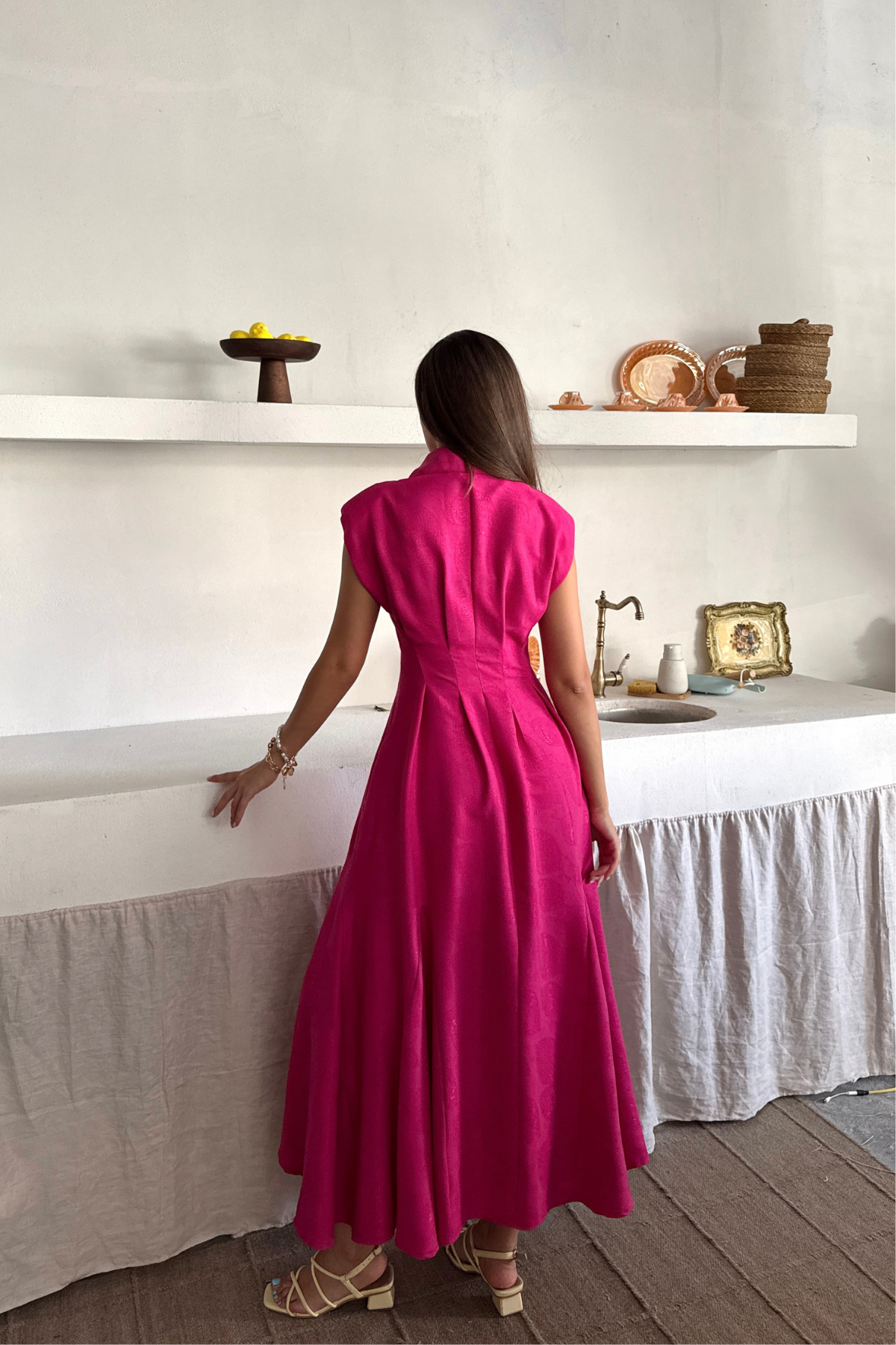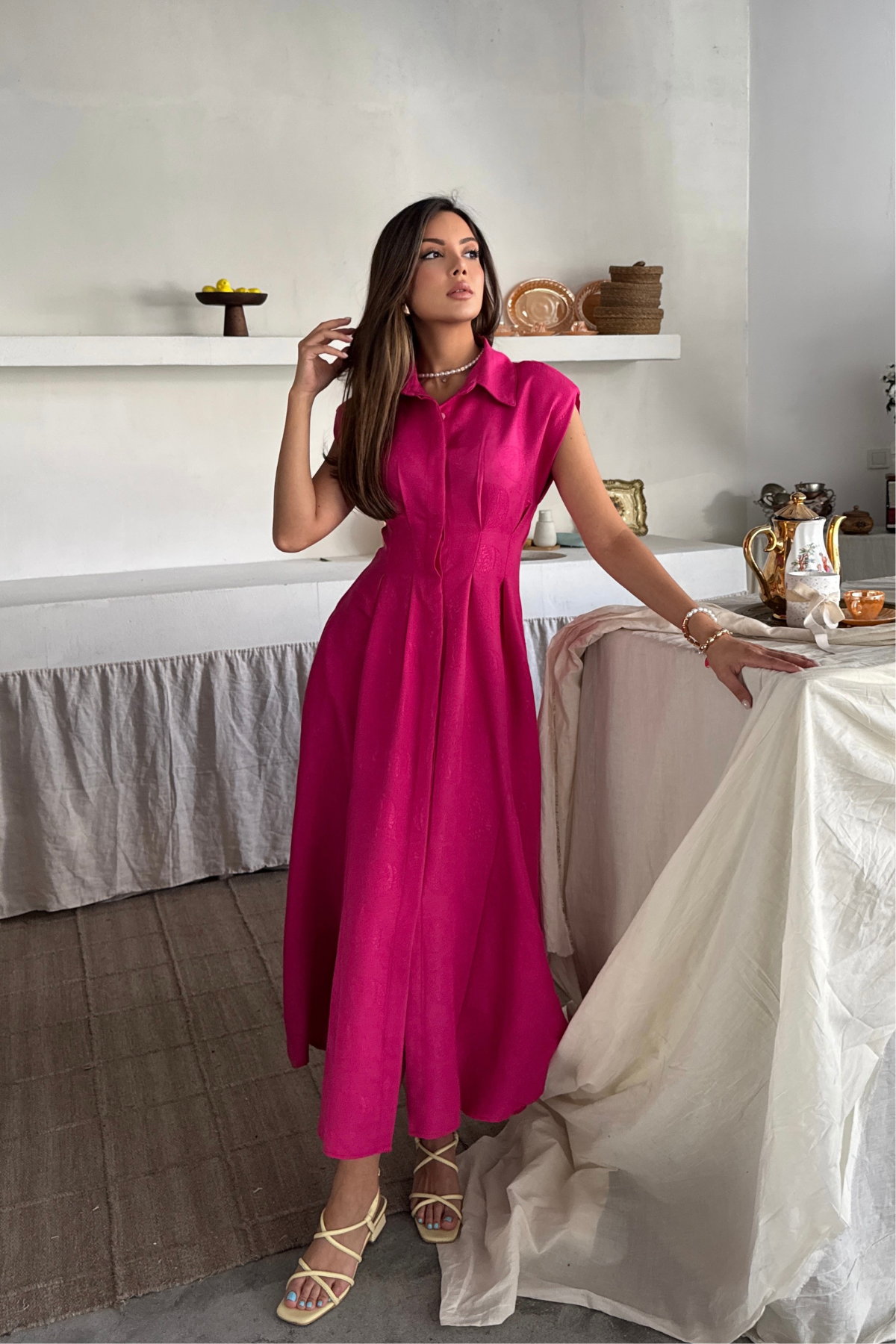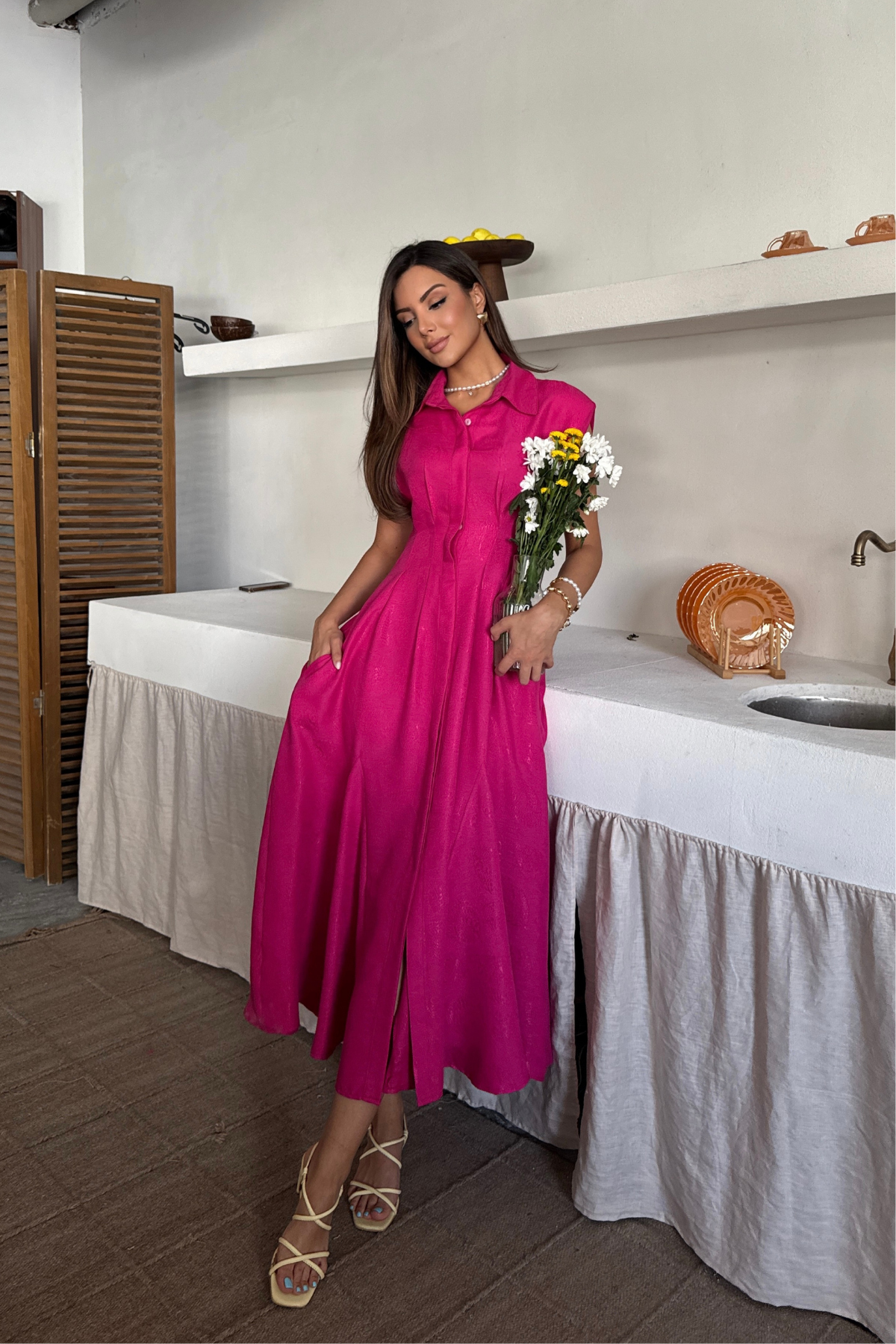 JAKARLI KETEN ELBİSE ÖNDEN YIRTMAÇLI CEPLİ - Fuşya