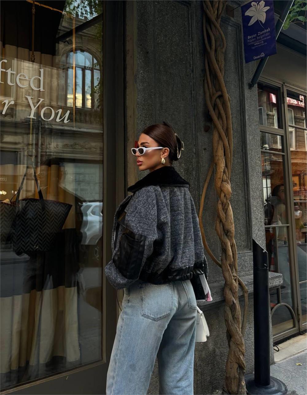 KAŞE CROP BOMBER - CEP DERİ YAKA KÜRK DETAYLI - Siyah