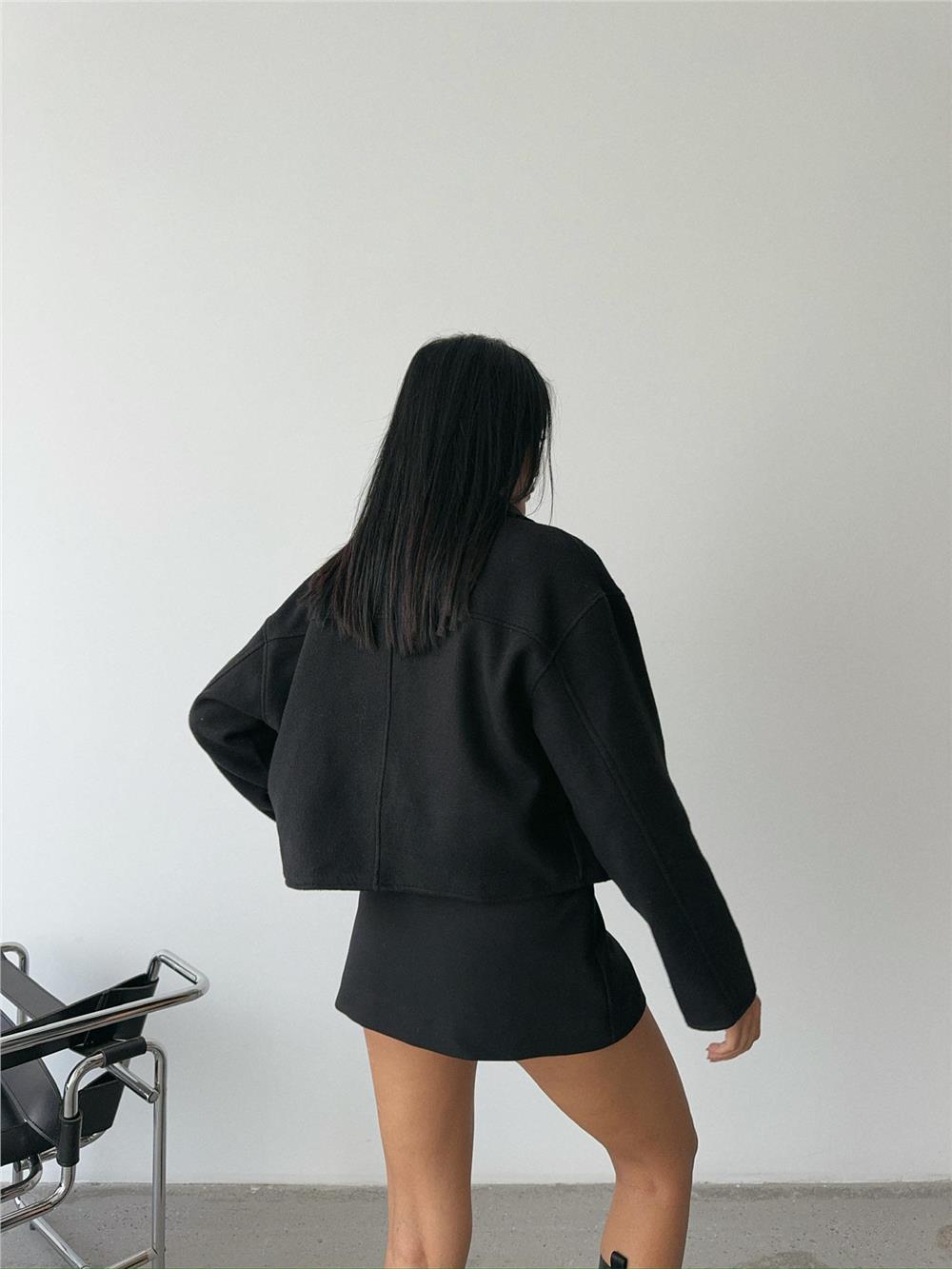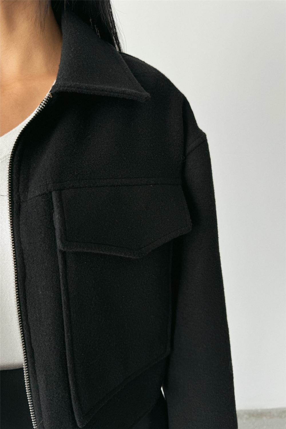 KAŞE CROP CEKET ÖNDEN FERMUARLI - Siyah