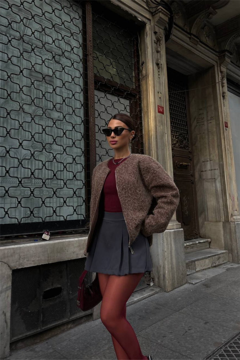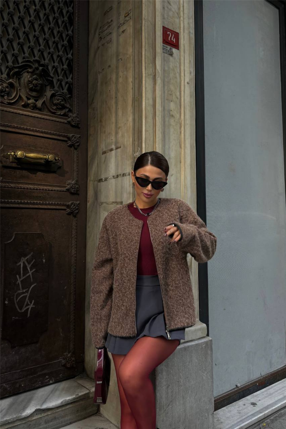 KAŞE FERMUARLI BLUZ - Kahverengi