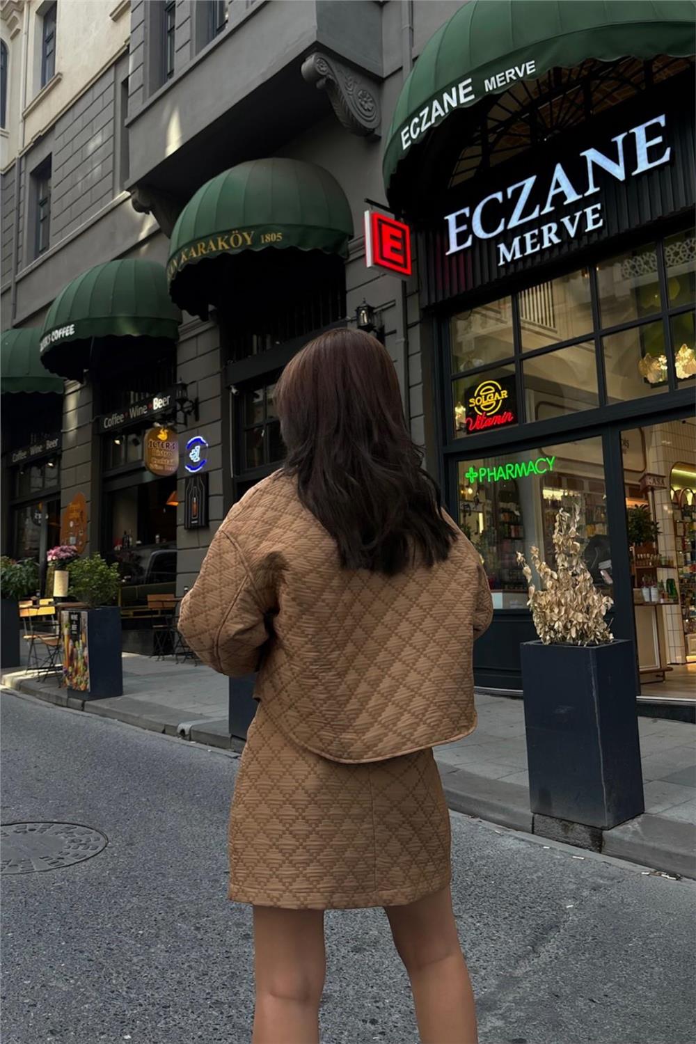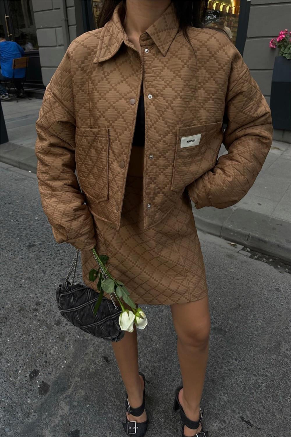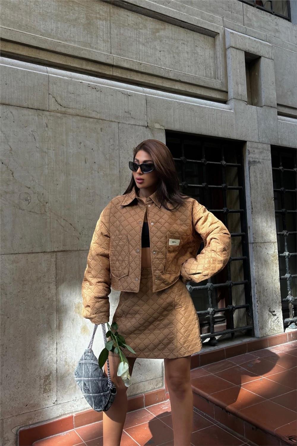 KAPİTONE CROP CEKET - ETEK TAKIM ARMA DETAYLI - Kahverengi
