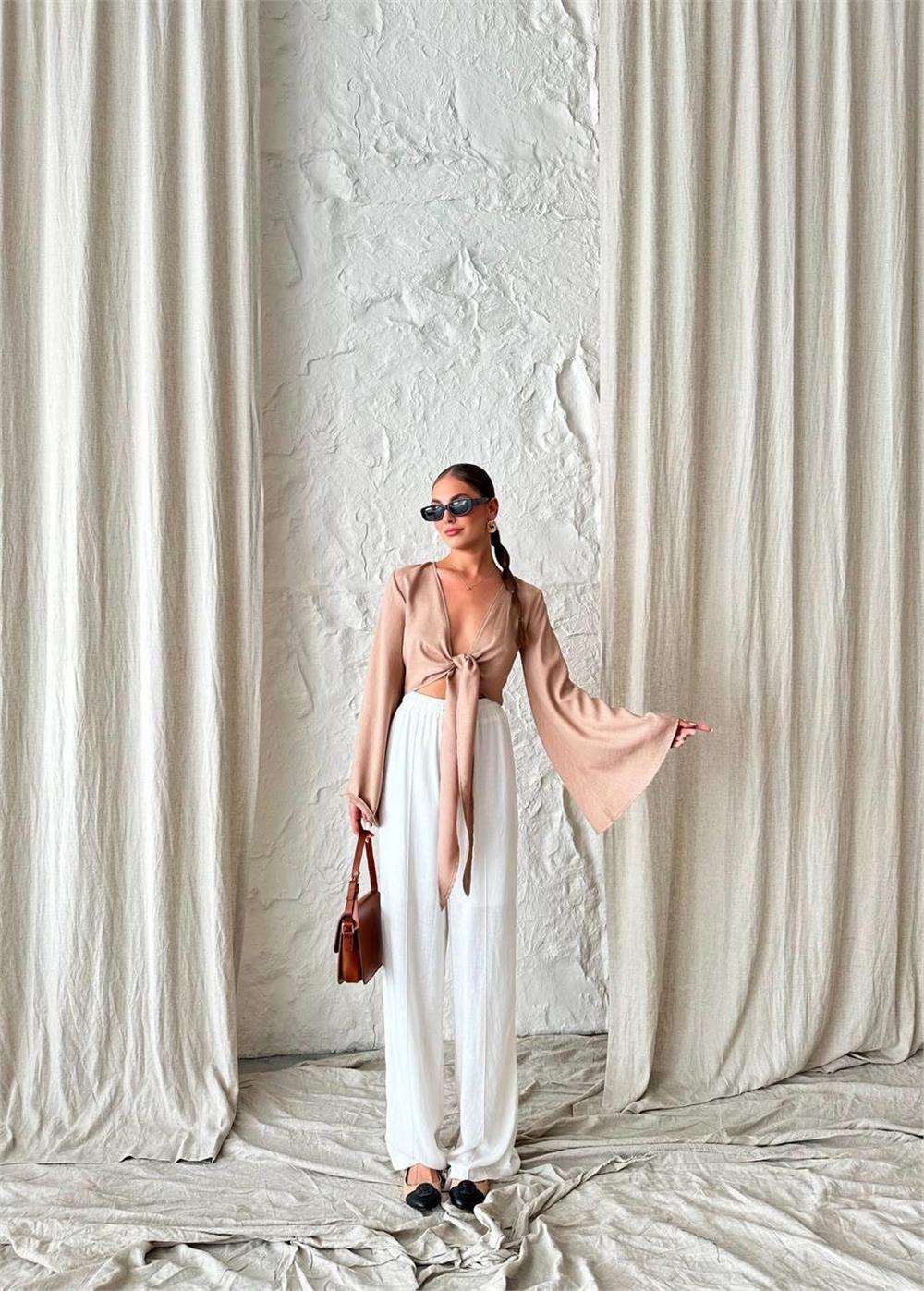 KETEN BAĞLAMA DETAYLI BLUZ İSPANYOL KOL - Kahverengi