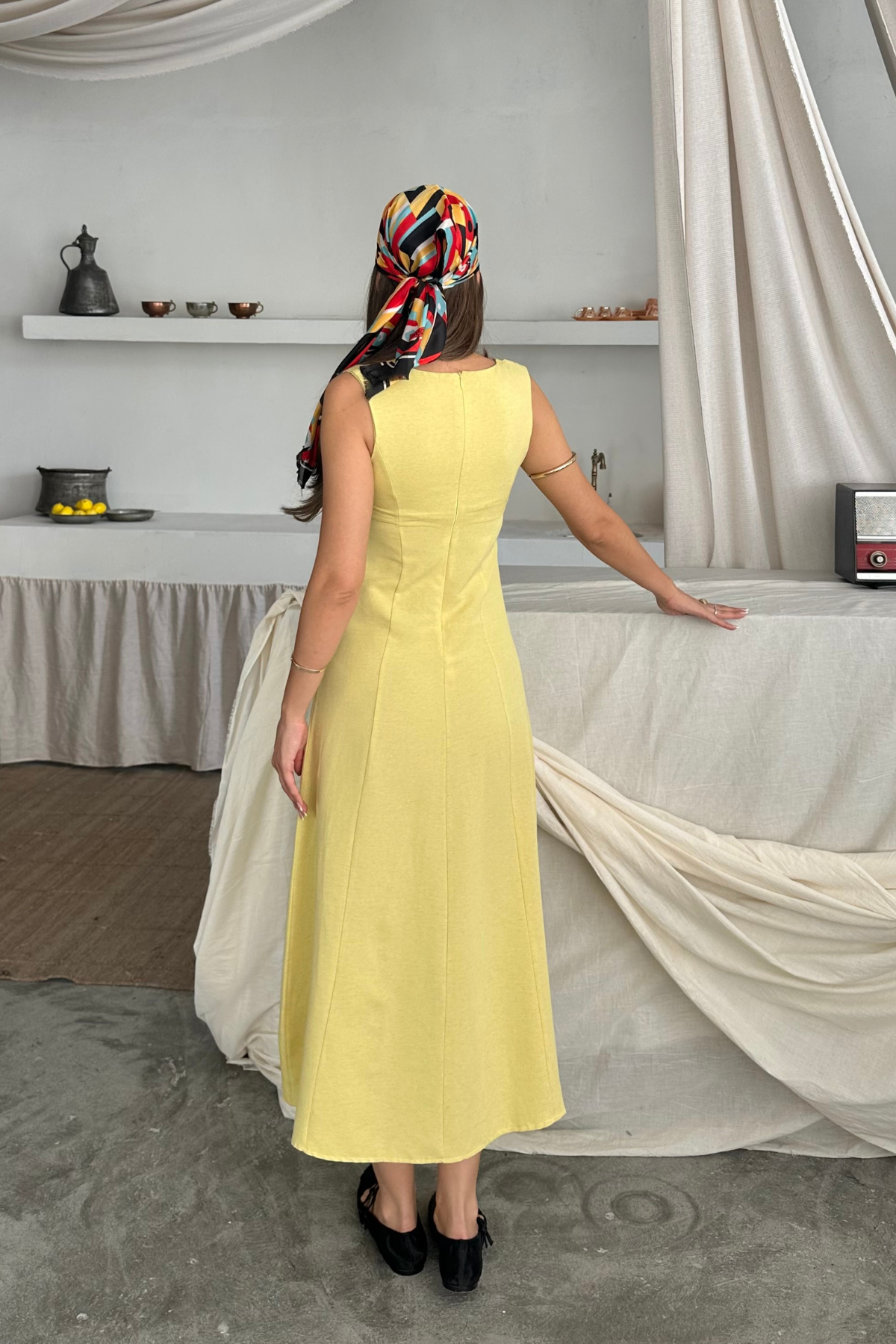 KETEN KOLSUZ KARE YAKA DÜĞME DETAYLI ELBİSE - Sarı