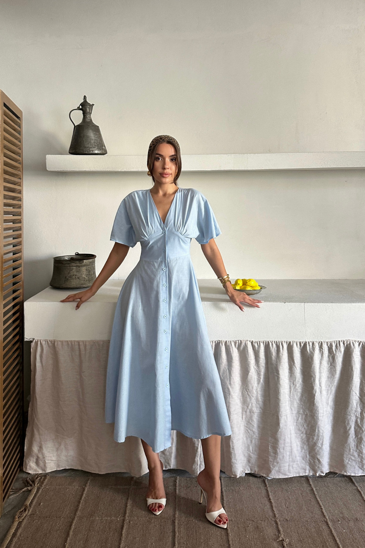 KETEN V YAKA ÖNDEN DÜĞMELİ ELBİSE - Mavi