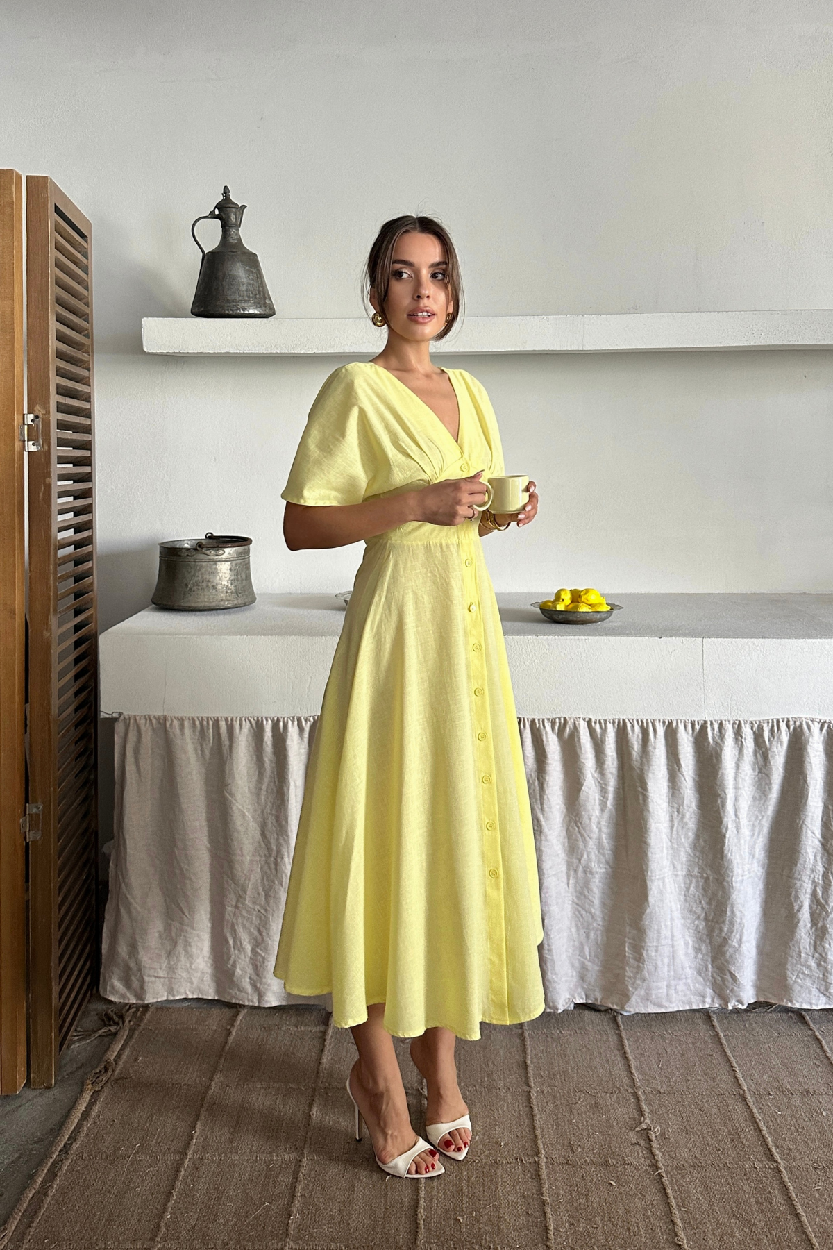 KETEN V YAKA ÖNDEN DÜĞMELİ ELBİSE - Sarı