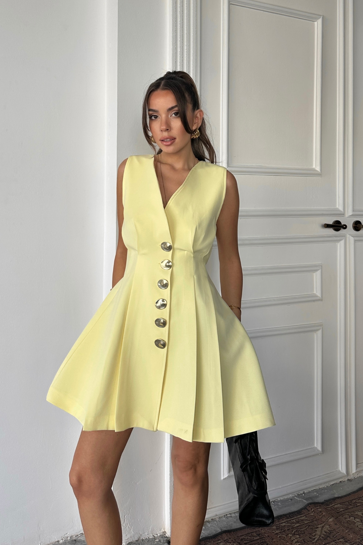 KOLSUZ GOLD DÜĞME ELBİSE PENS VE PİLELİ KISA - Sarı