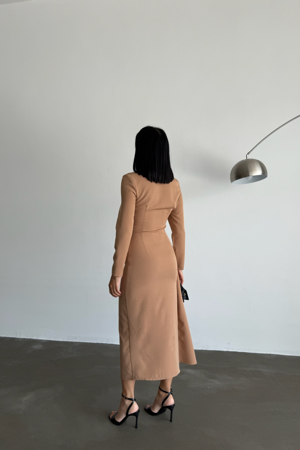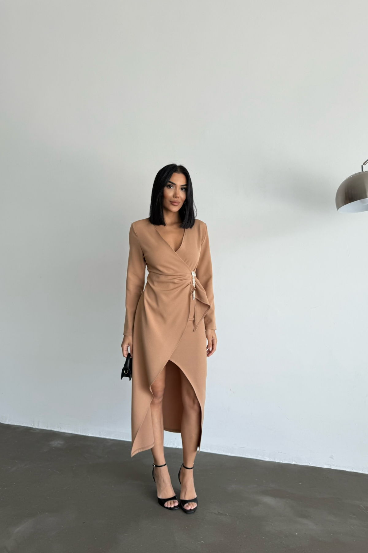 KRUVAZE BROŞ DETAYLI ELBİSE - bej