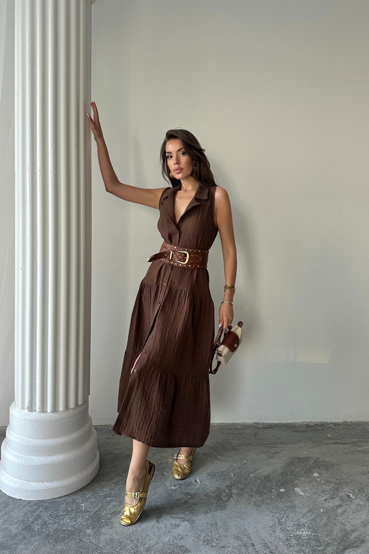 MÜSLİN ELBİSE GÖMLEK YAKA KOLSUZ ÖNDEN DÜĞMELİ - Kahverengi