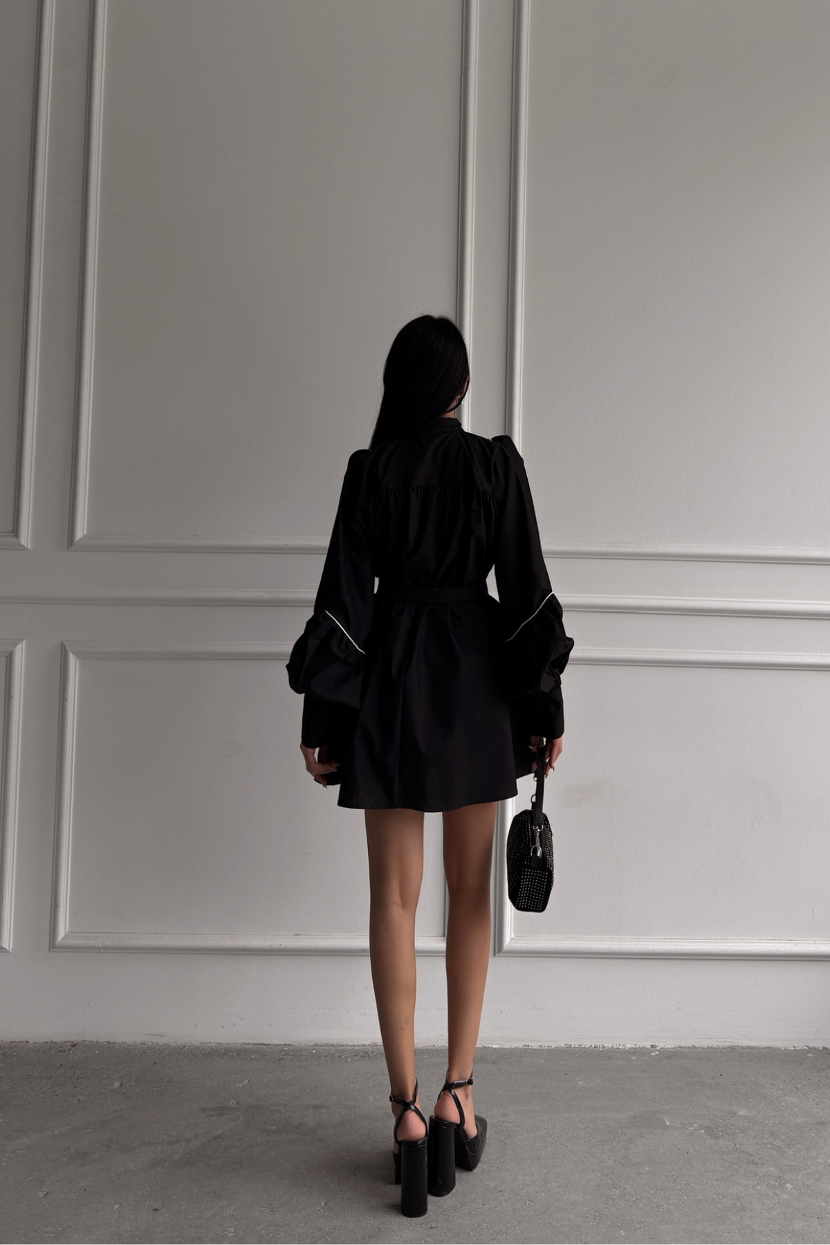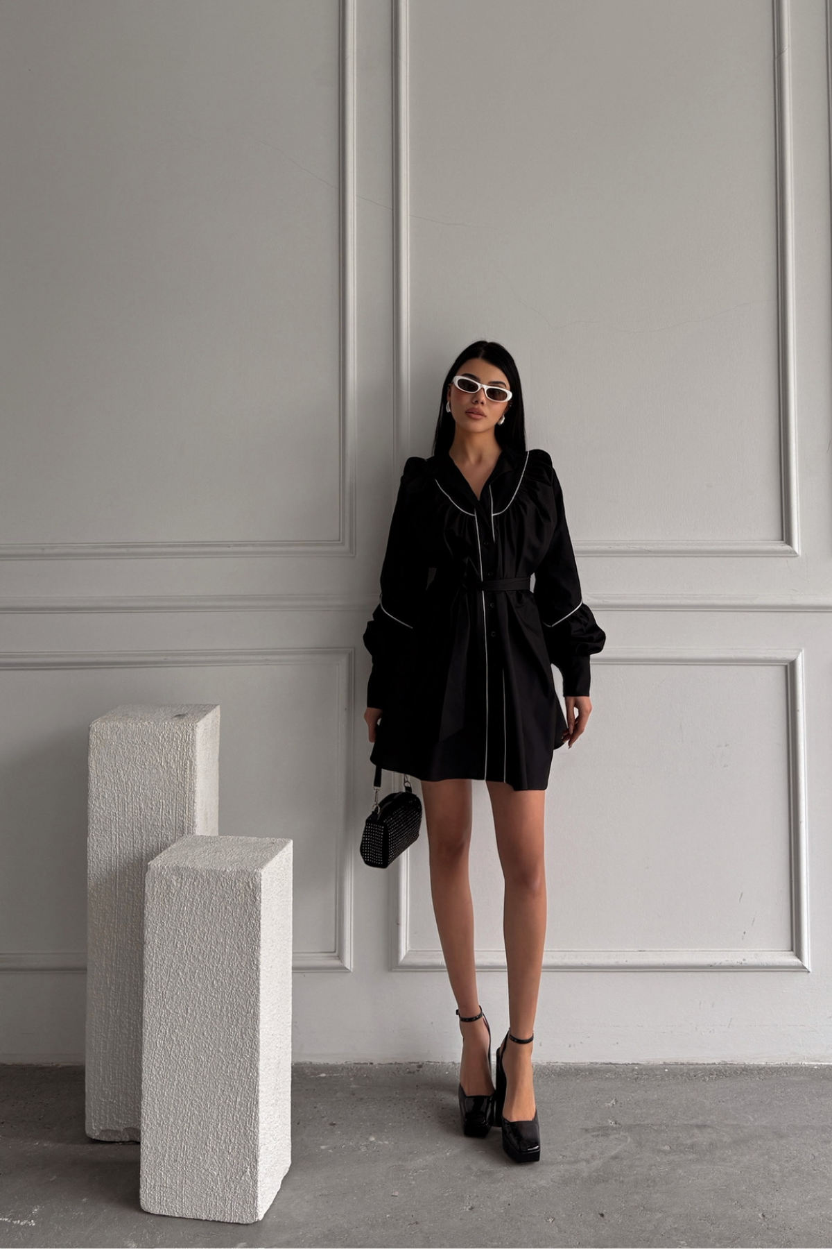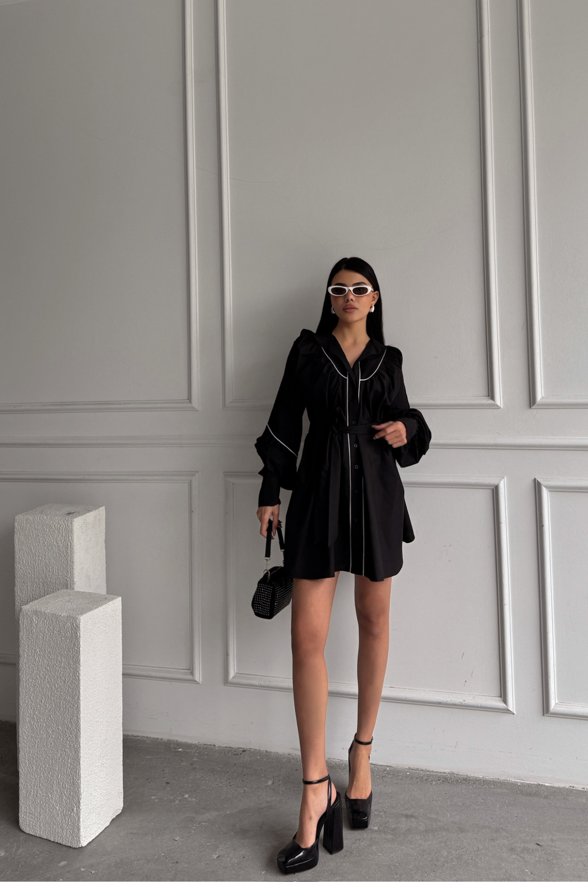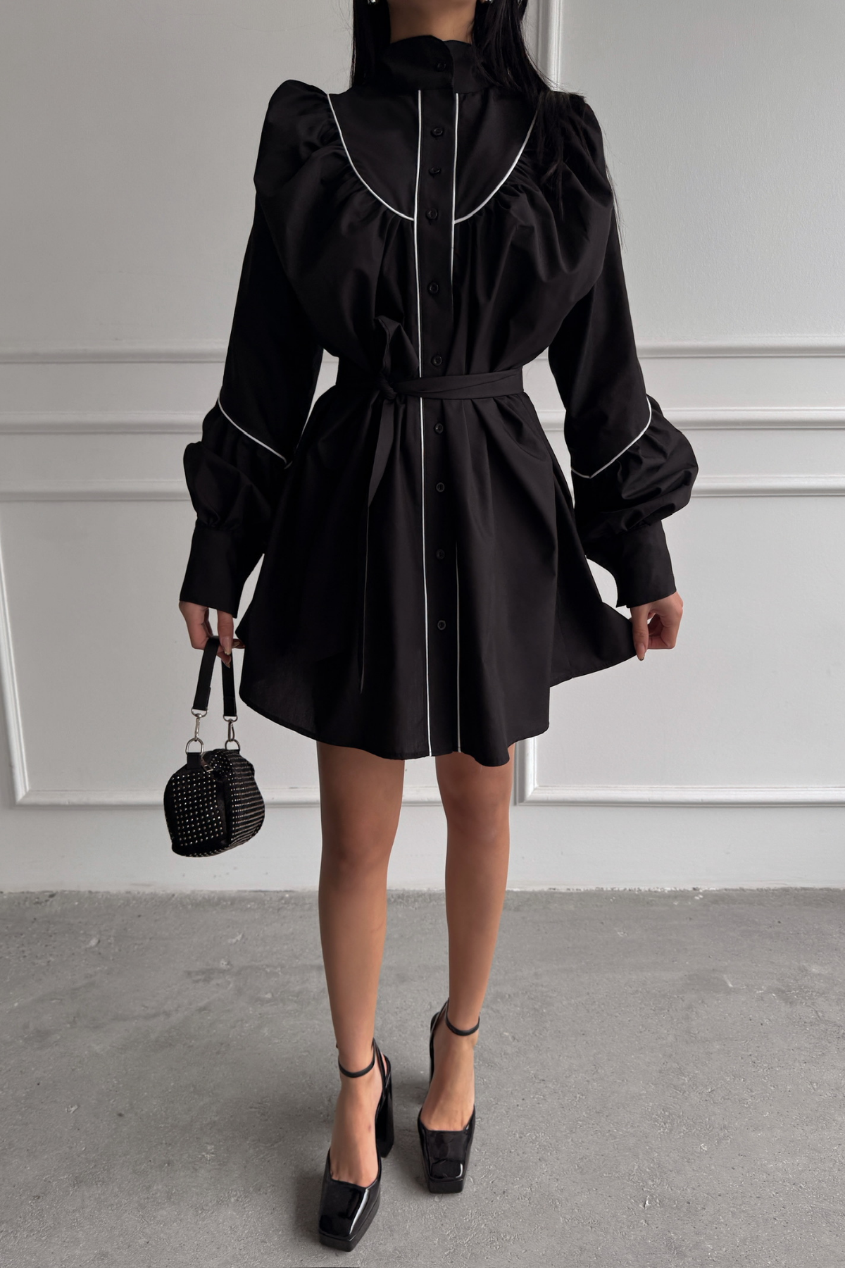 ÖNDEN DÜĞMELİ POPLİN KLOŞ ELBİSE BAĞLAMA KEMER DETAYLI - Siyah