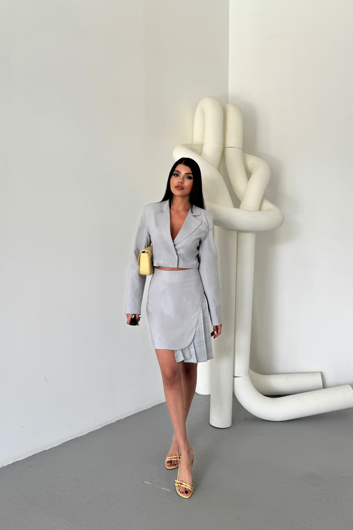 POLYVİSKON CROP CEKET - EKOSE PİLE DETAYLI ETEK TAKIM - Gri