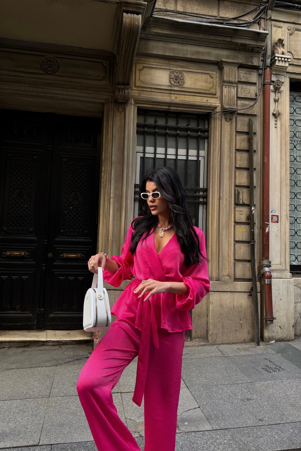 SATEN KRUVAZE BAĞLAMALI BLUZ- PANTOLON TAKIM - Fuşya