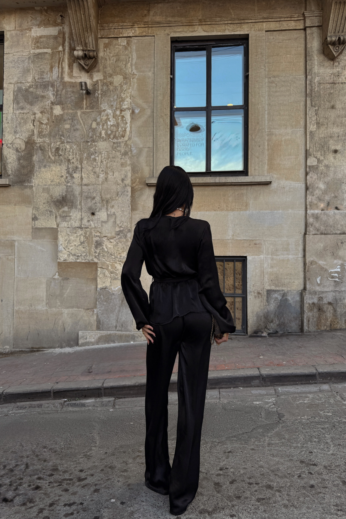 SATEN KRUVAZE BAĞLAMALI BLUZ- PANTOLON TAKIM - Siyah