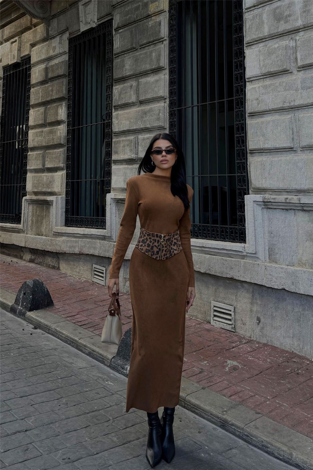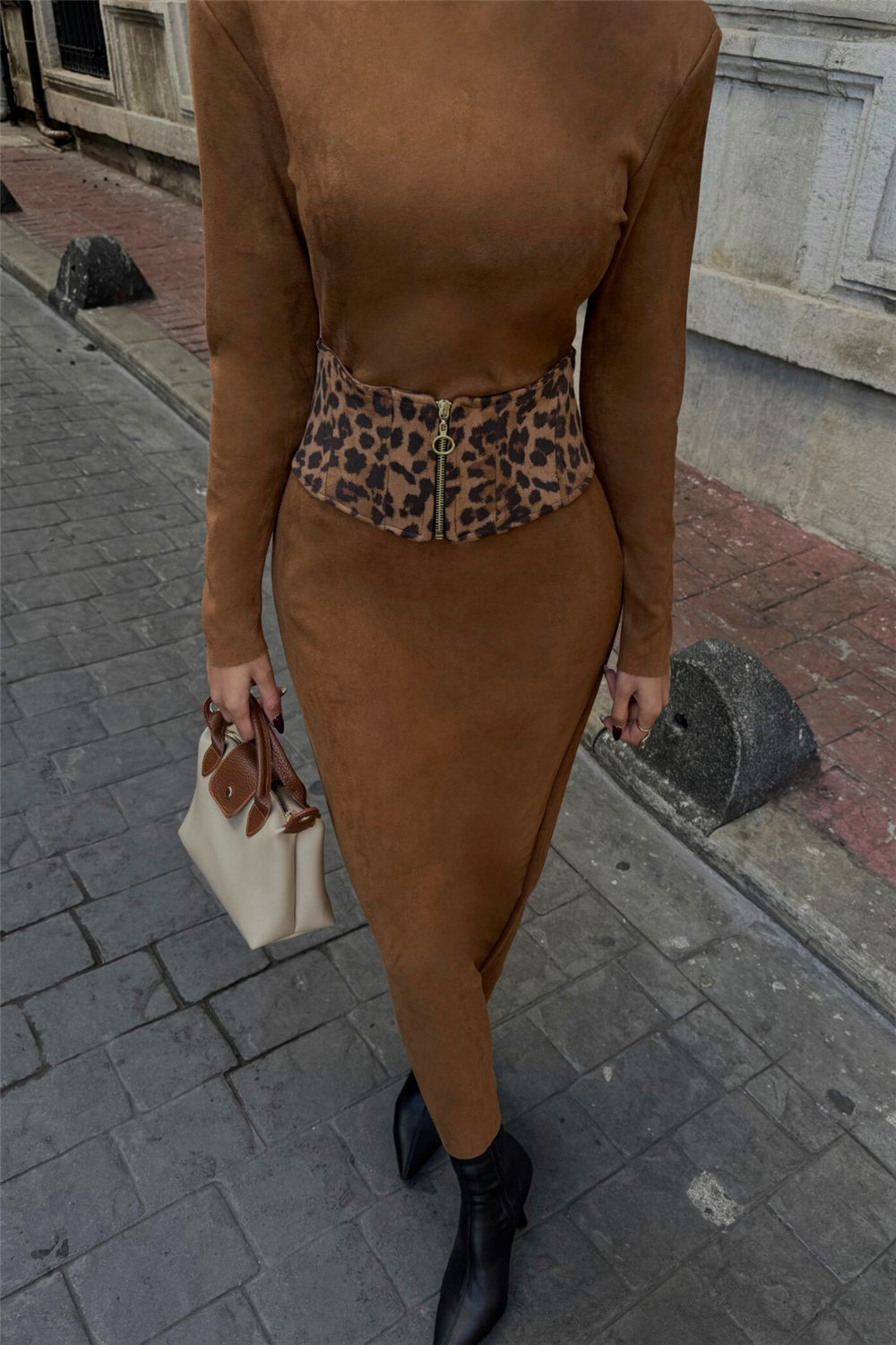 SÜET ELBİSE LEOPAR DESENLİ KORSE KEMERLİ - Taba