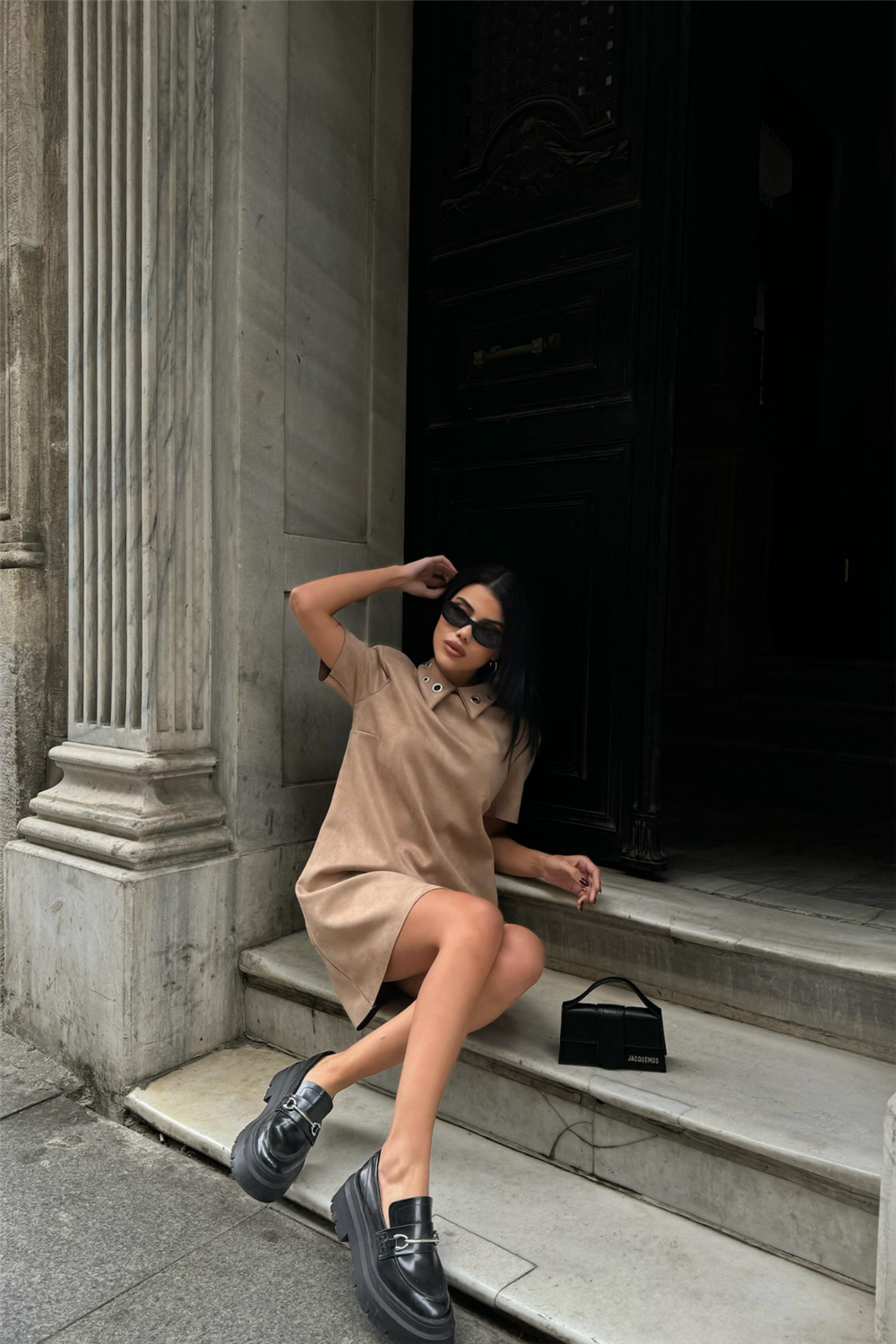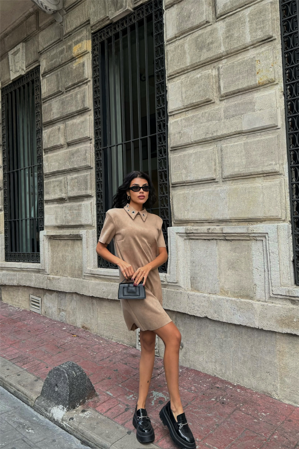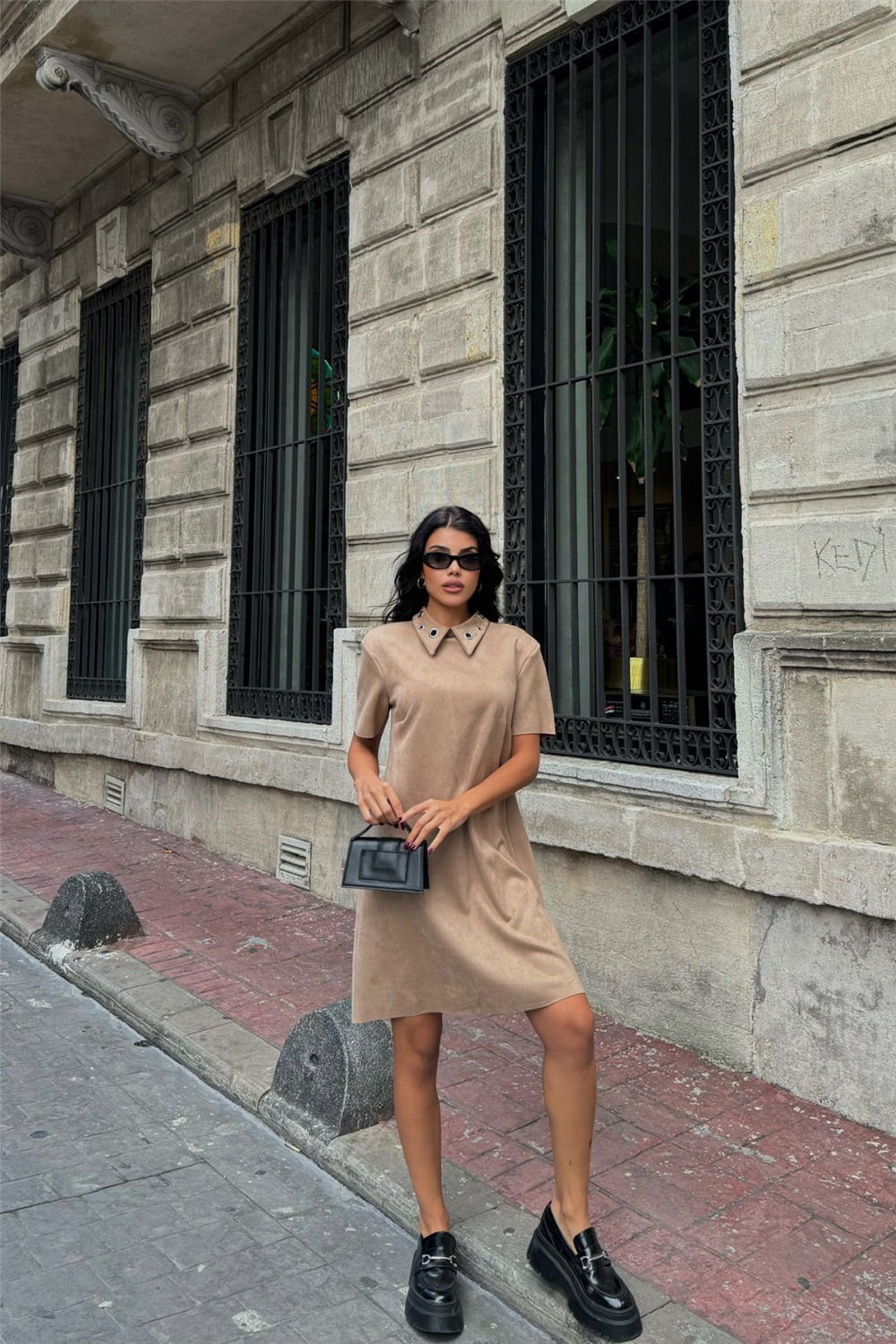 SÜET KISA ELBİSE YAKA KUŞGÖZÜ DETAYLI - Bej