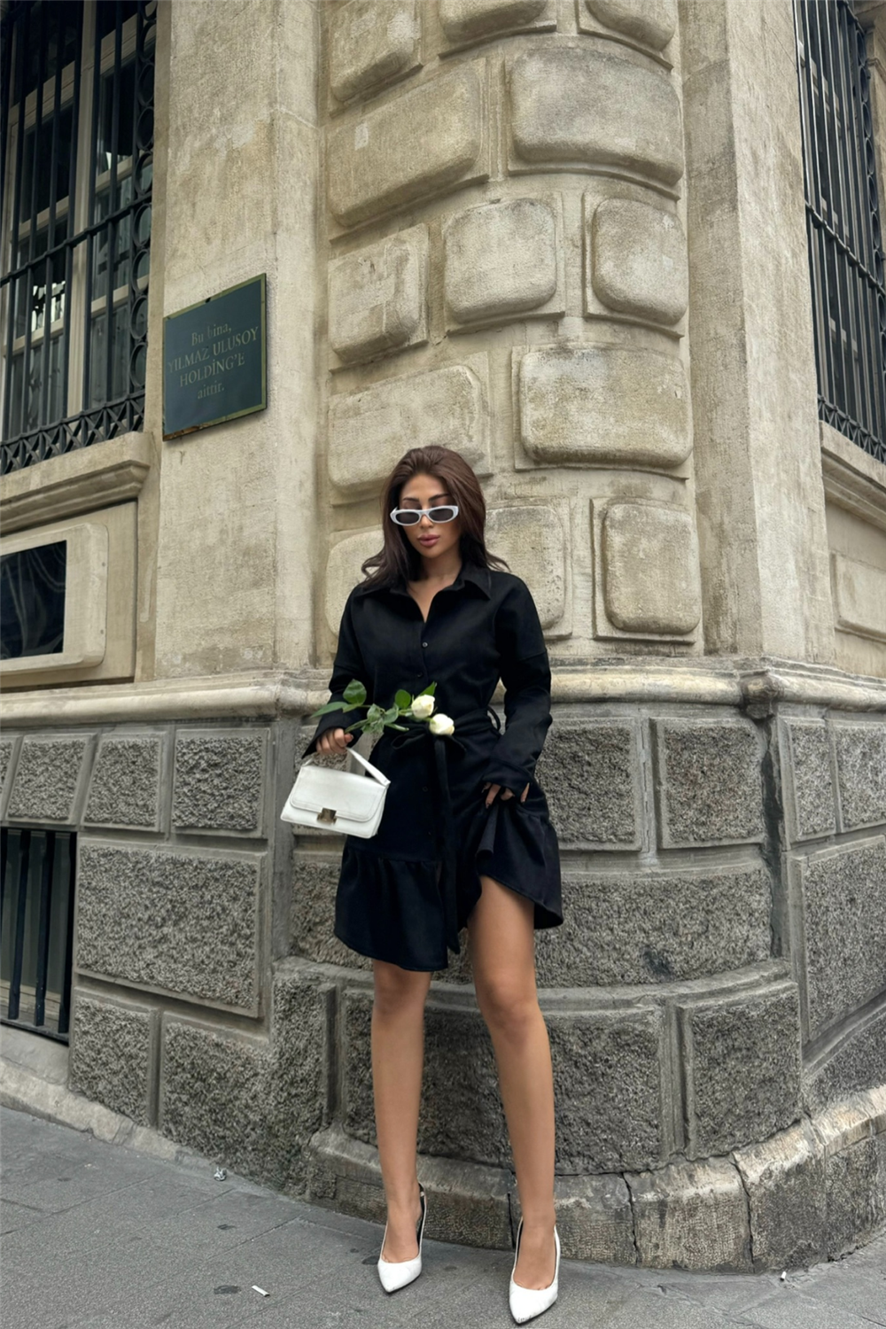 SÜET ÖNDEN DÜĞMELİ ETEKUCU FIRFIRLI KEMERLİ ELBİSE KISA - Siyah
