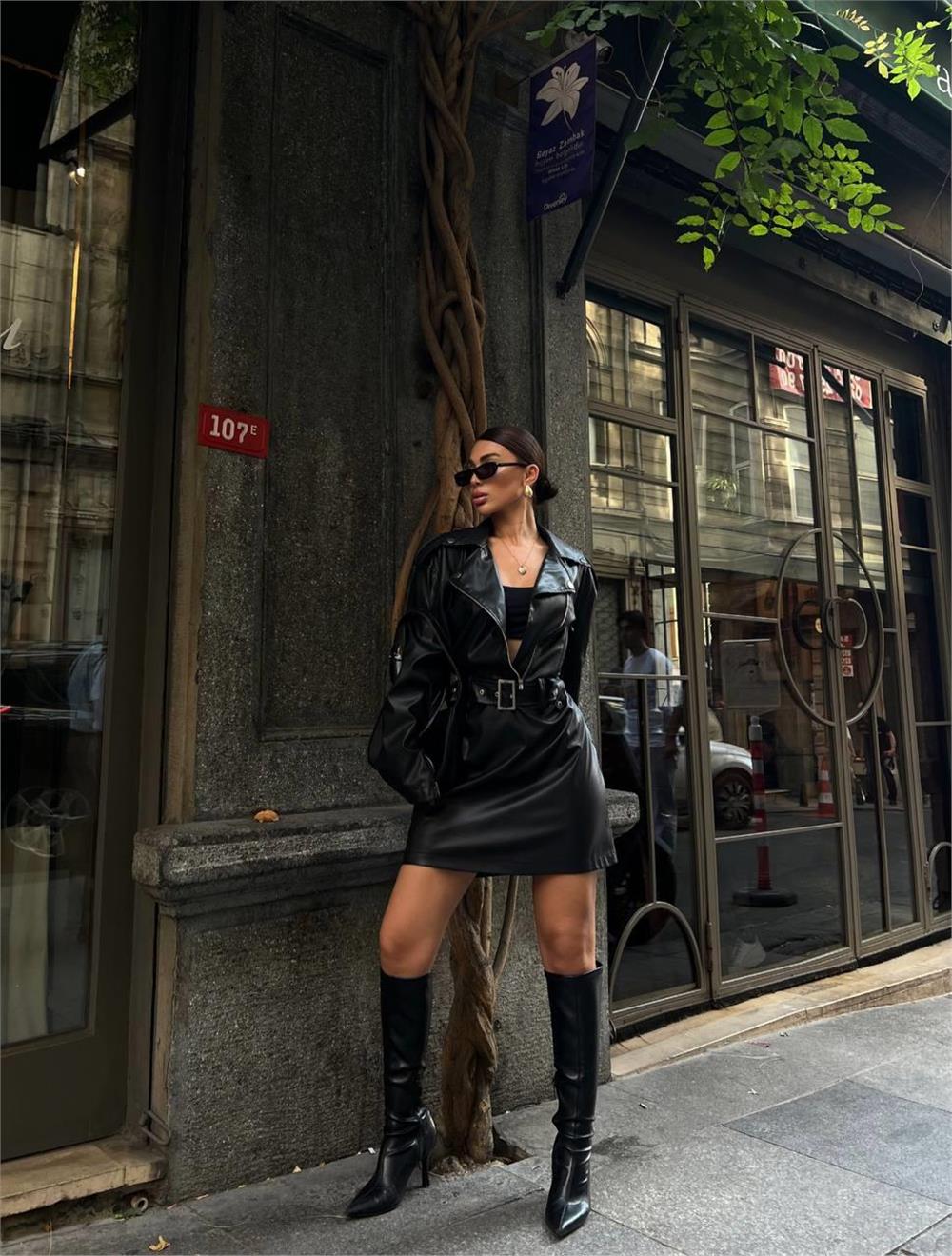 SİYAH DERİ KISA ELBİSE ÜST CEKET GÖRÜNÜMLÜ - Siyah