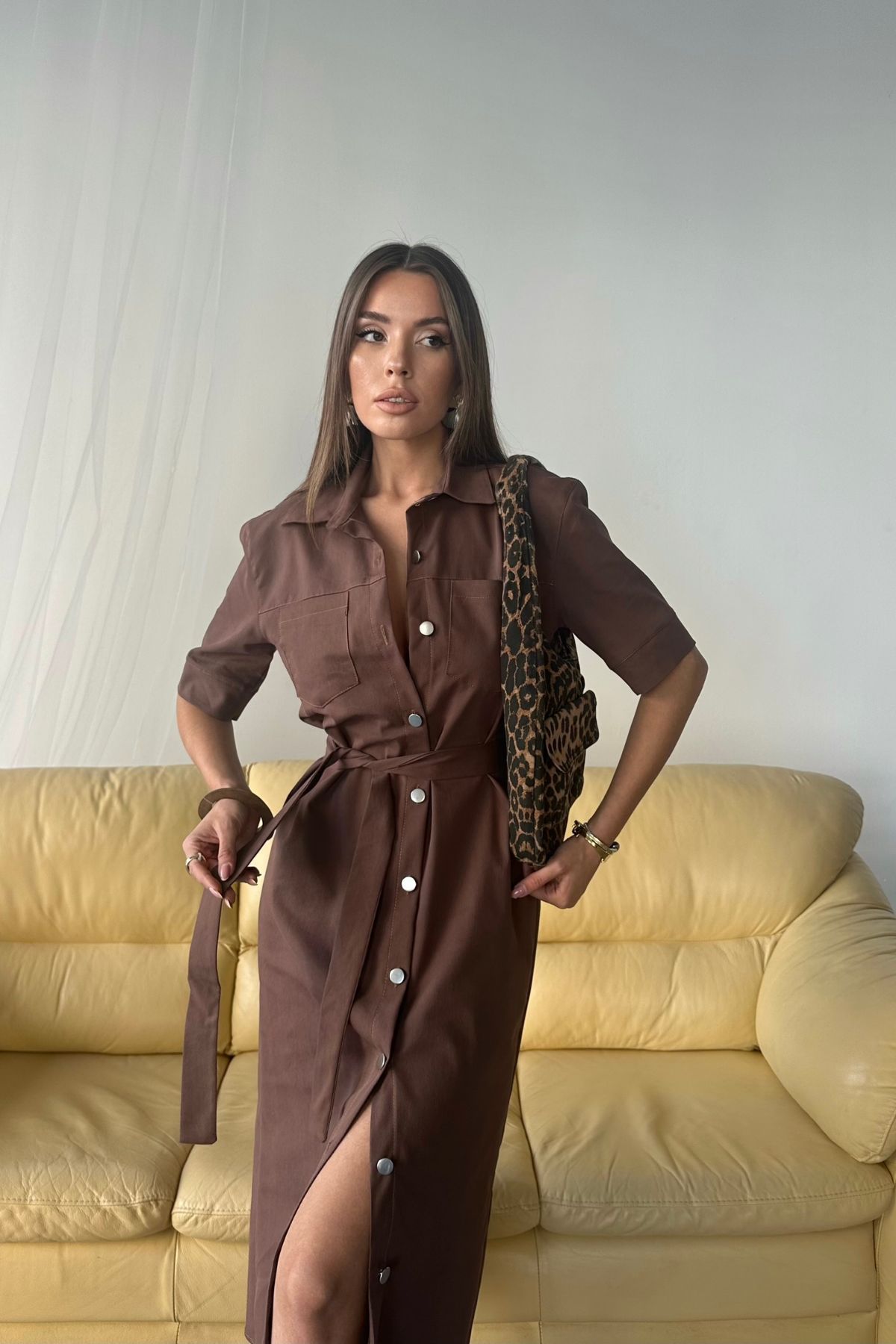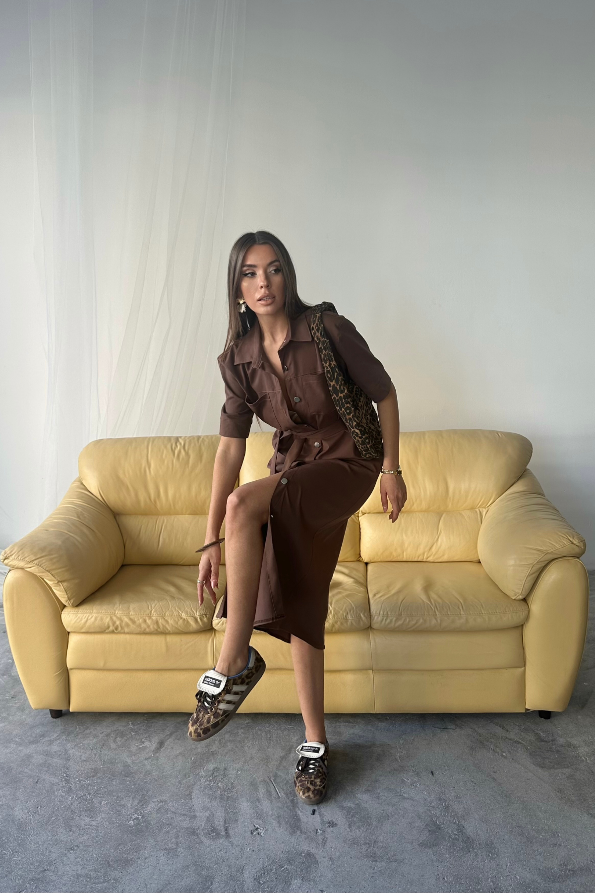 TENCEL ÖNDEN DÜĞMELİ KISA KOL ELBİSE - Kahverengi