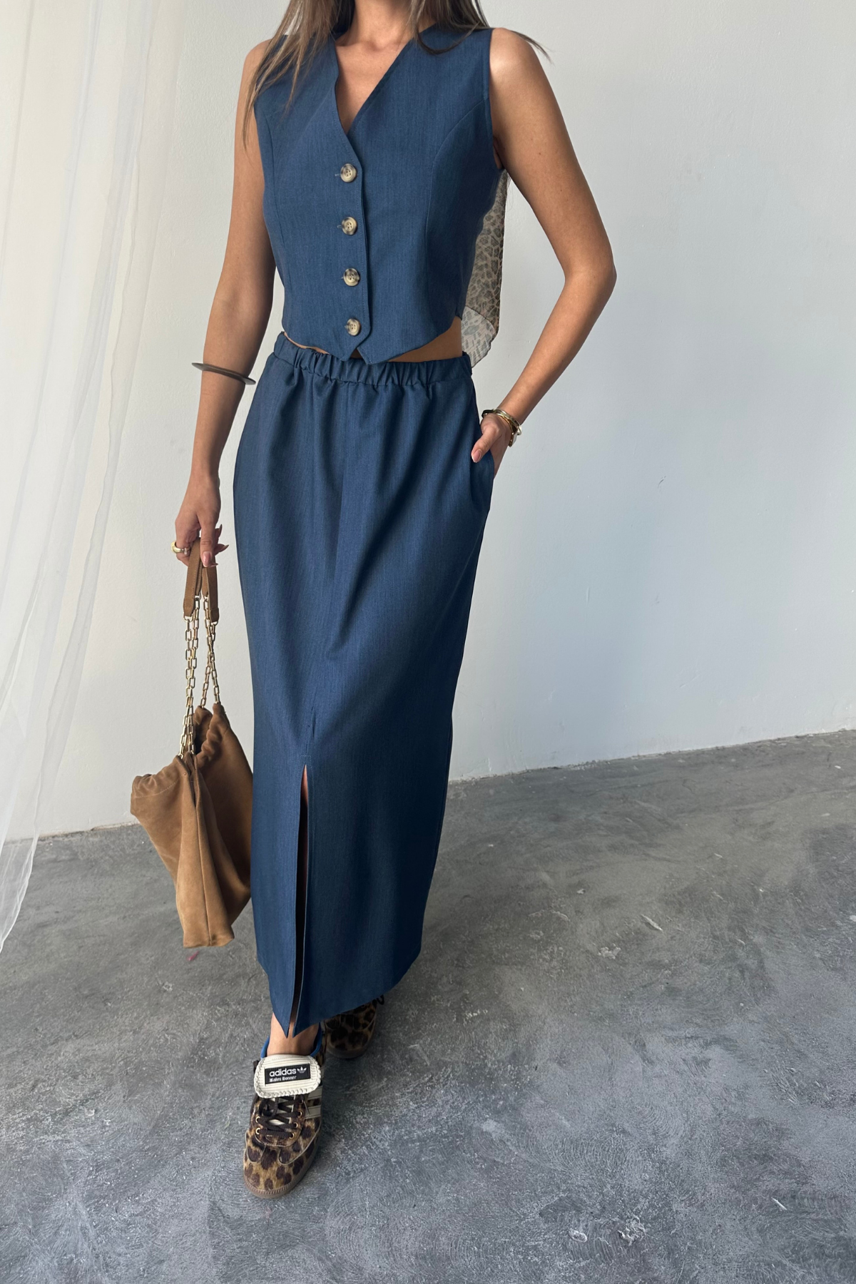 TENCEL YELEK - YIRTMAÇLI ETEK TAKIM - İndigo