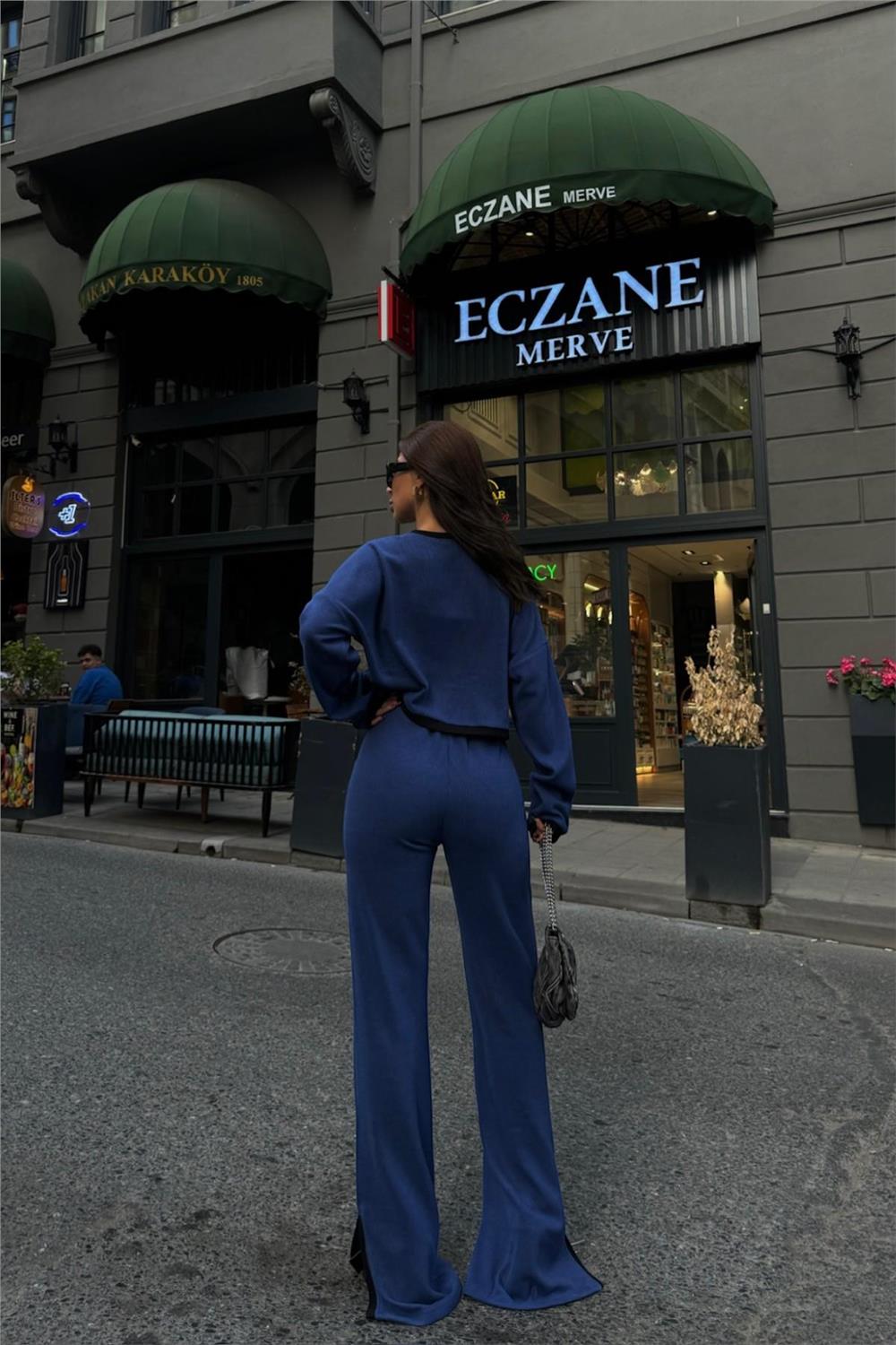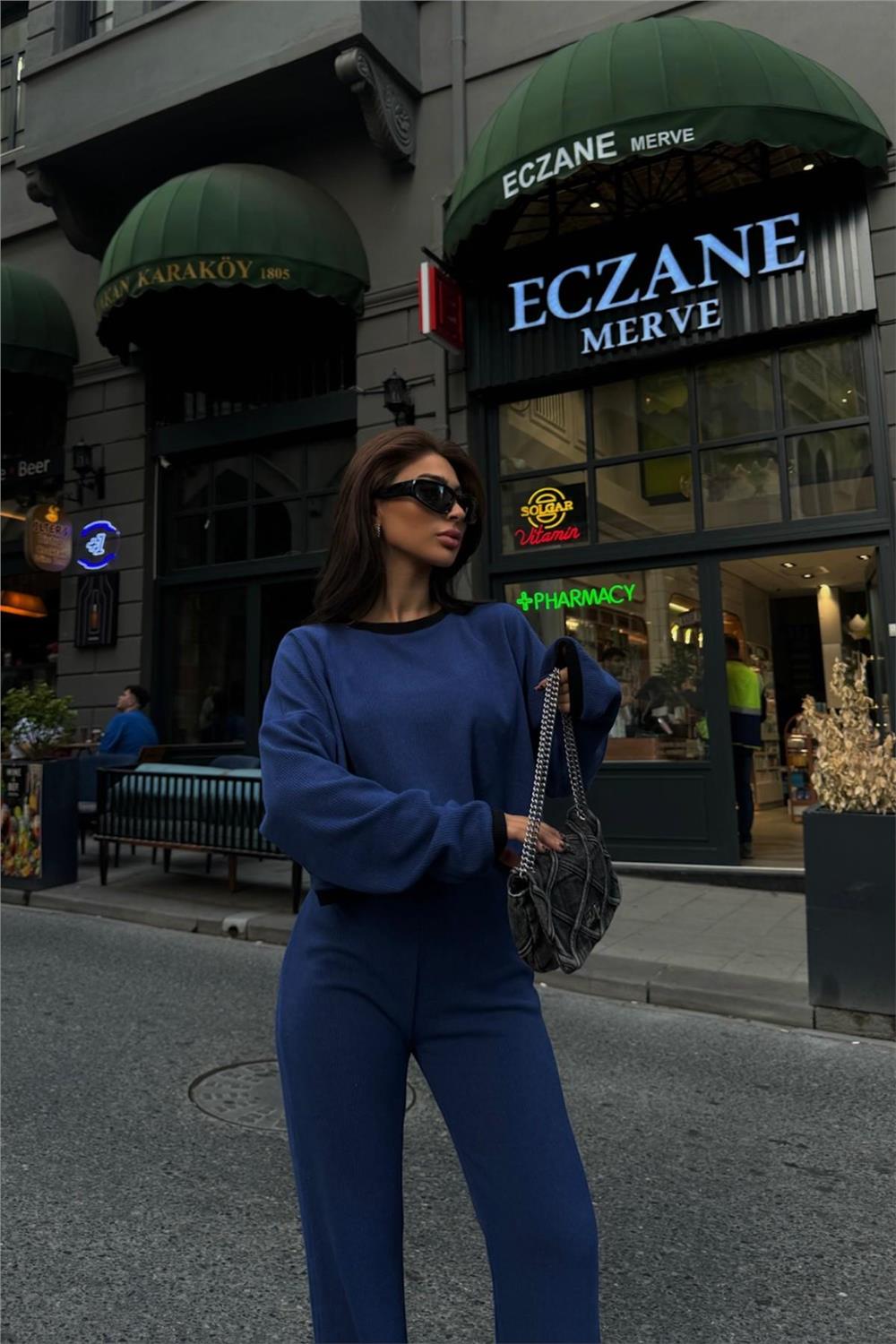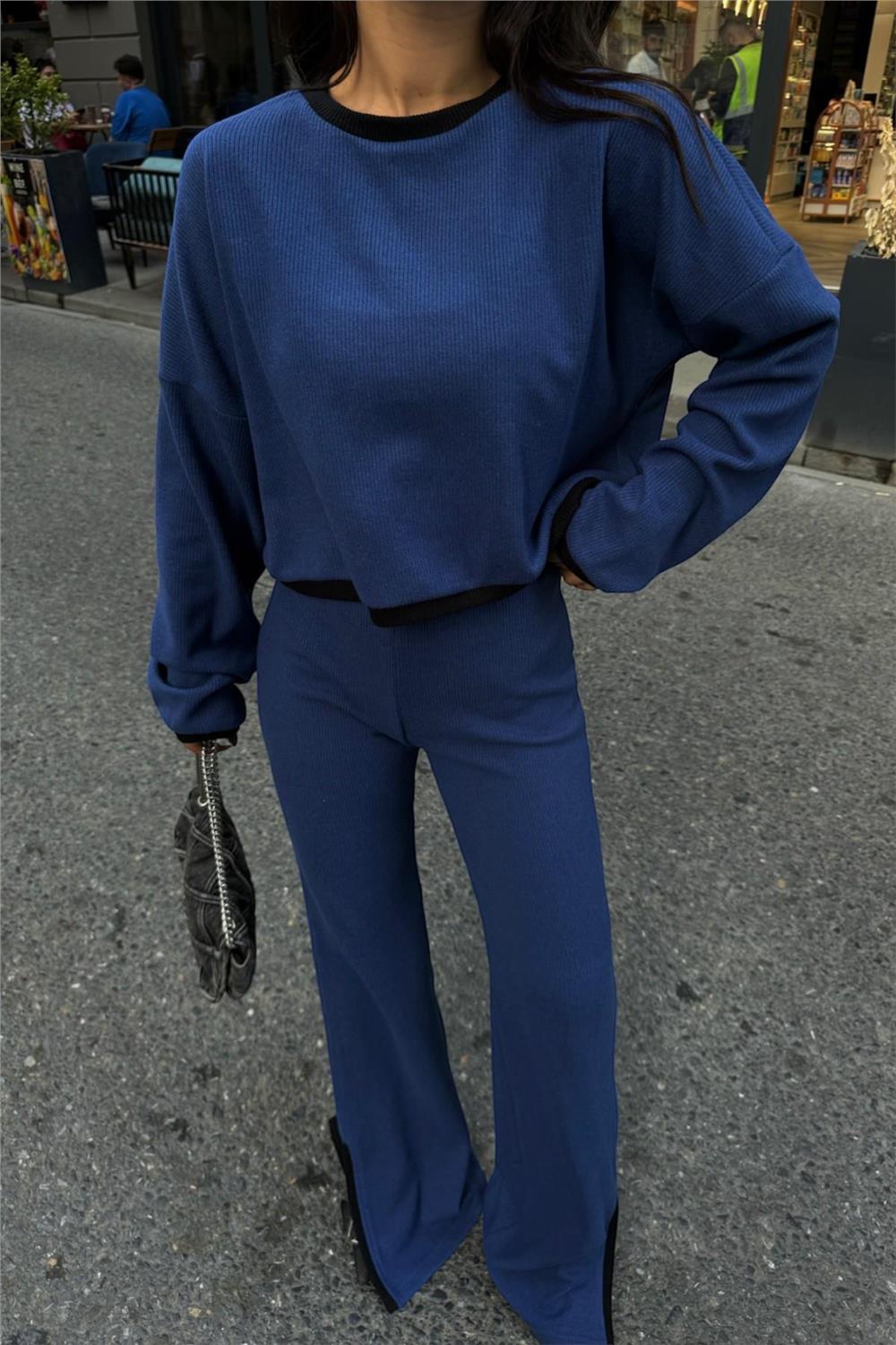 TRİKO TAKIM SWEAT-PANTOLON ŞERİT GEÇİŞLİ YIRTMAÇ DETAYLI - Lacivert