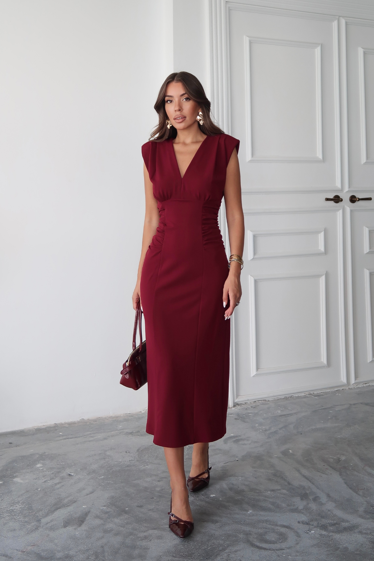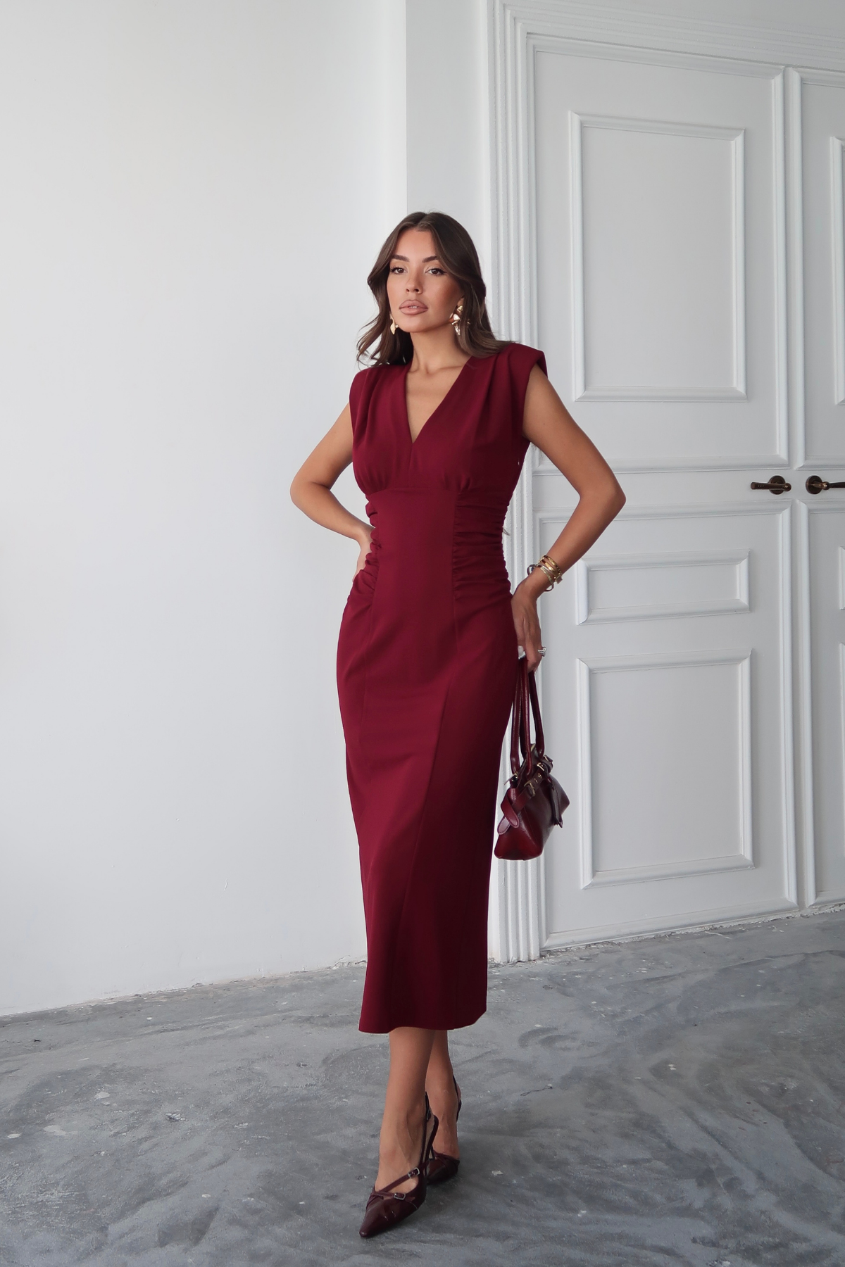 V YAKA YANLAR BÜZGÜ DETAYLI SCUBA ELBİSE - Bordo