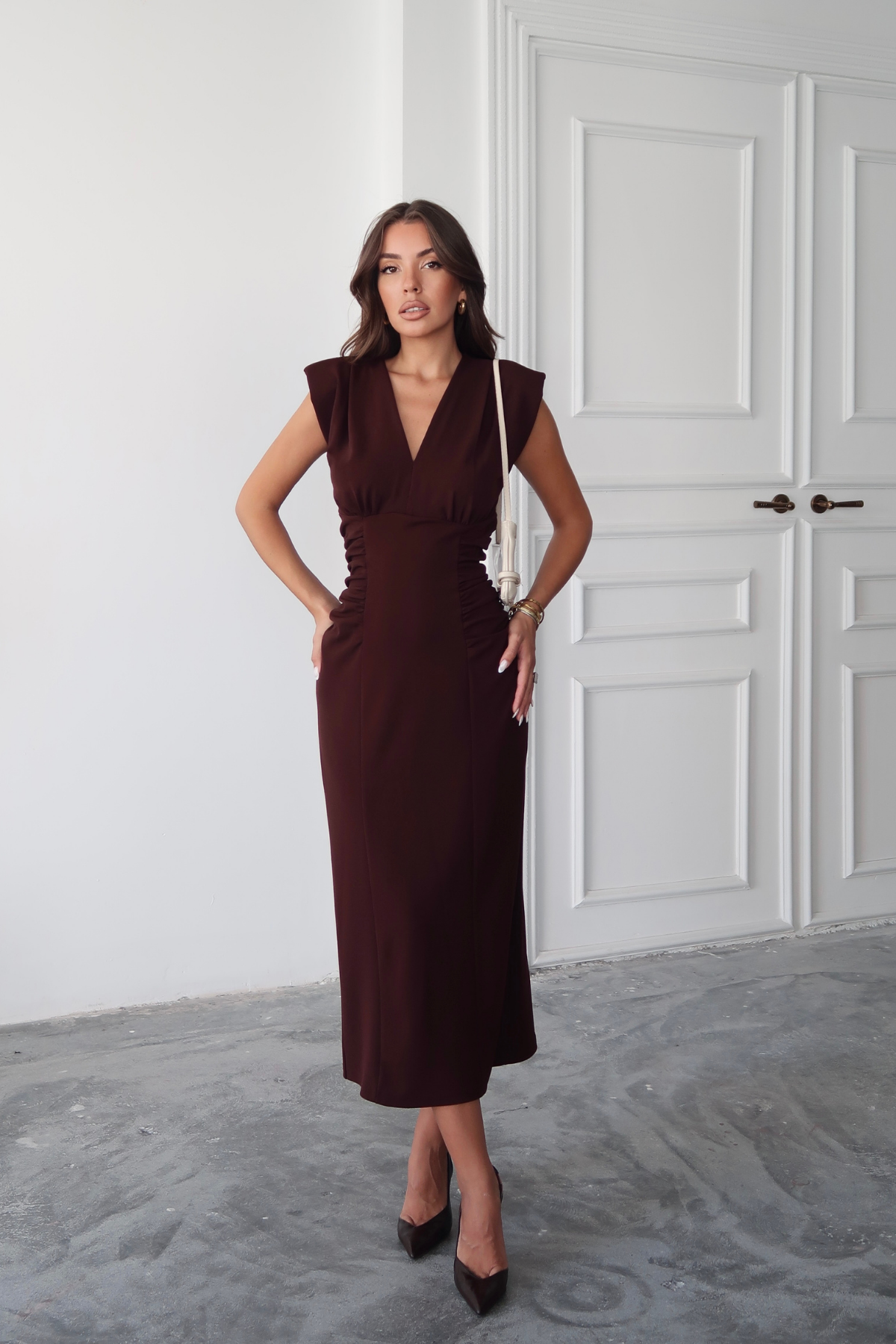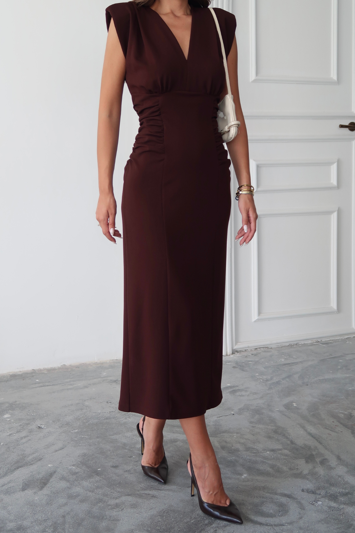 V YAKA YANLAR BÜZGÜ DETAYLI SCUBA ELBİSE - Kahverengi