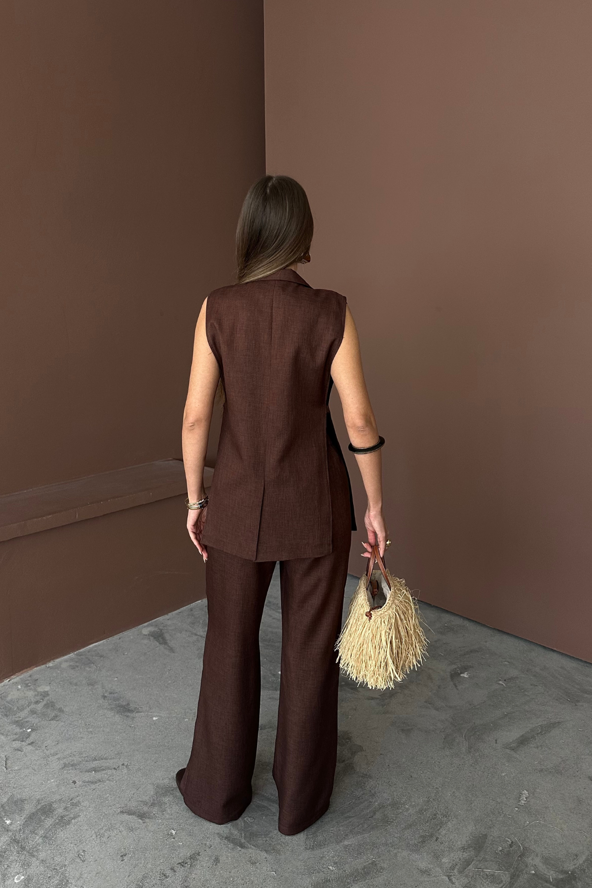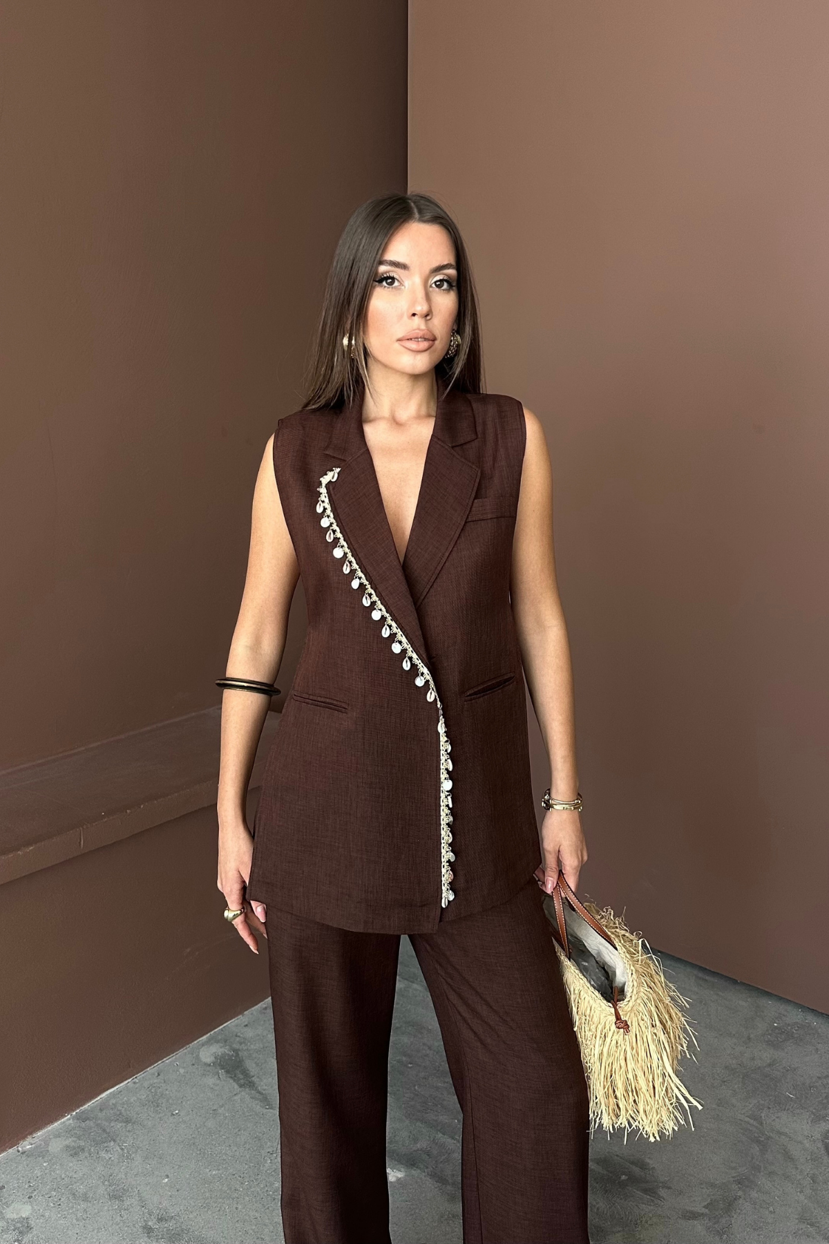 YAKA MİDYE KABUĞU SIRALI YELEK - PANTOLON TAKIM KETEN KUMAŞ - Kahverengi