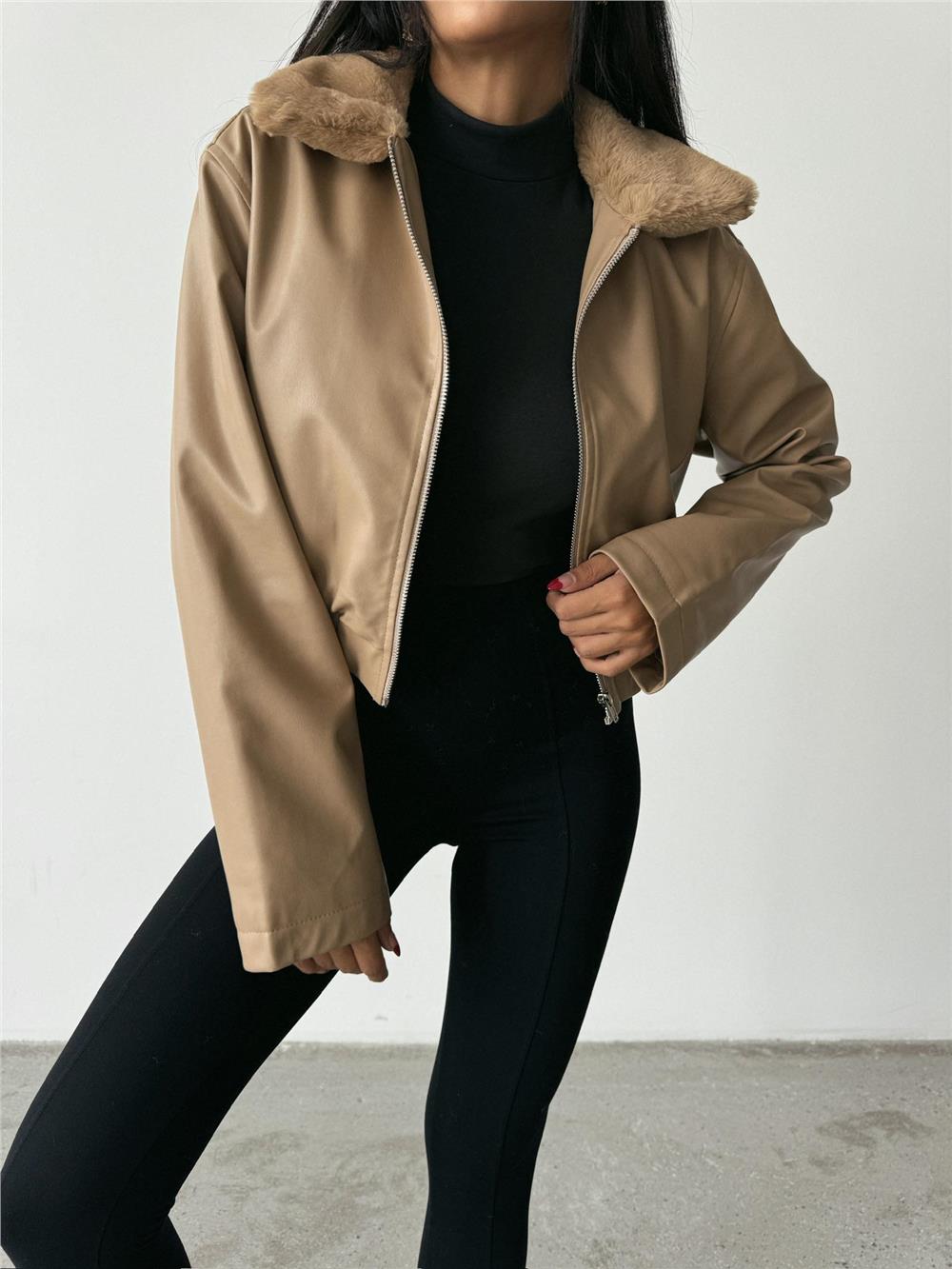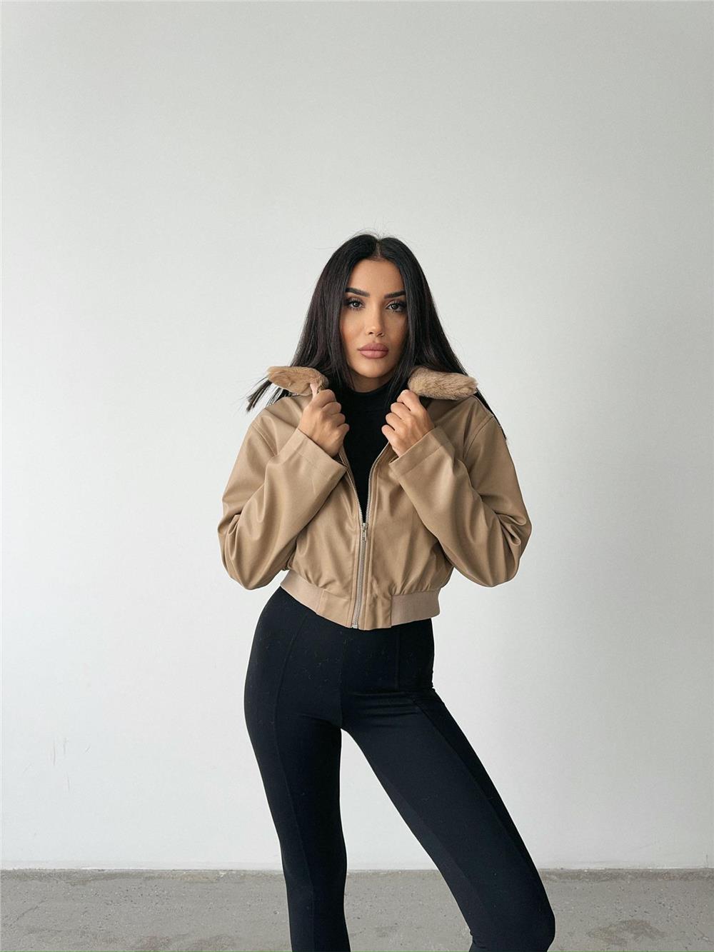 YAKASI KÜRKLÜ DERİ BOMBER MONT - Bej