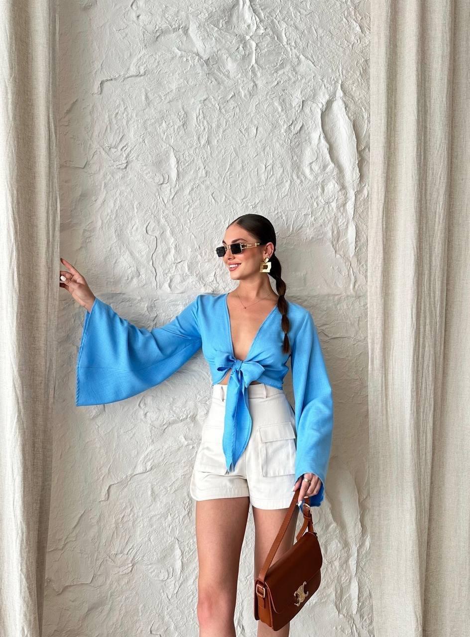 YANDAN BAĞLAMA DETAYLI KOLSUZ BLUZ - Mavi